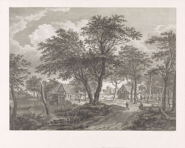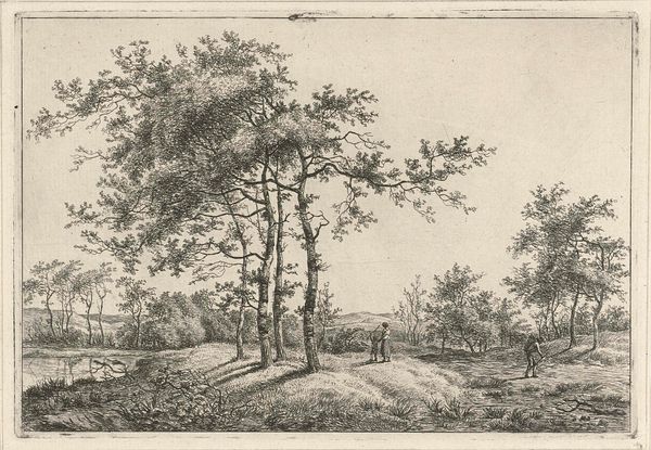 Anthonie Waterloo created this artwork, "Man with a dog along a forest path", using etching. Notice how the trees, with their towering presence, dominate the scene; in many cultures, they are symbols of life, growth, and connection between the earth and the heavens. This resonates with ancient beliefs, where sacred groves were seen as places of spiritual communion. We can trace the 'axis mundi,' or world tree motif, from Norse mythology's Yggdrasil, connecting the realms of gods and humans, to the tree of knowledge in Judeo-Christian traditions. Trees, therefore, are not merely botanical elements, but powerful symbols through which humanity has explored fundamental questions about existence. Here, the etching captures a profound sense of nature's enduring presence, engaging viewers on a deep, subconscious level. These symbols create a dialogue between the past and the present, showing how artistic motifs resurface, evolve, and take on new meanings in different historical contexts.
