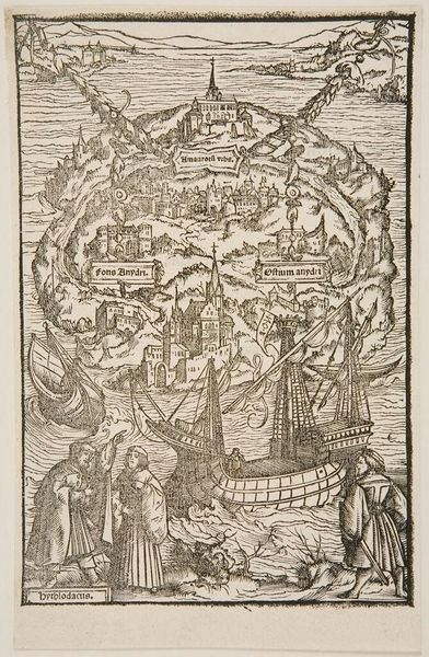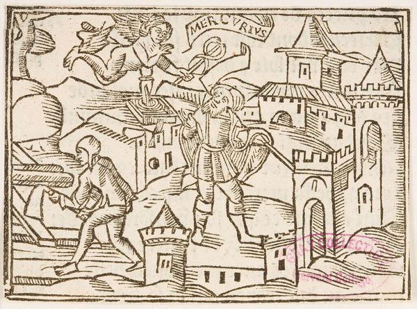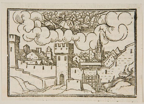 Curator: Illustration XLVII is an intriguing, undated piece from an anonymous artist, currently housed in the Harvard Art Museums. The stark black and white contrast gives it a dramatic quality. Editor: Immediately, I'm struck by the dense composition. The figures are embedded within the architectural forms, creating a powerful sense of confinement or perhaps integration with the city itself. Curator: It's likely meant to depict a scene from classical literature, possibly Virgil's Aeneid given the labeling "ENEAS" next to the character resting on a bed. Woodcuts like this often served to illustrate printed books and disseminate classical stories to a wider audience. Editor: The linear quality of the woodcut—the parallel hatching, the sharp angles—contributes to a frenetic energy. There is also a play between the solidity of the built environment and the more fluid, dynamic rendering of the figures. Curator: Right. This was a period of growing literacy and the increasing use of printed images in shaping public perception. Editor: Ultimately, the tension of line and form, figure and ground, renders a potent vision. Curator: I agree. It speaks to the evolving role of art in disseminating knowledge.