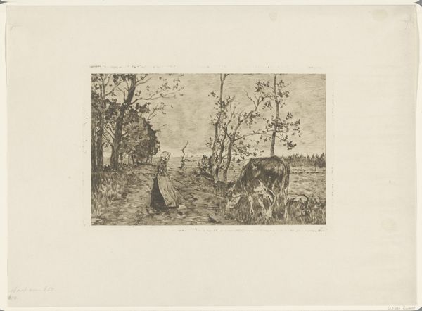 Charles Jacque created this etching titled, "In the Forest," with a plate measuring 85 by 121 millimeters. The dense network of lines creates a seemingly impenetrable view into a dark forest. Jacque’s composition emphasizes a limited tonal range with the delicate network of etched lines which define the trees, foliage and the ground. The interplay of light and shadow, achieved through varying densities of line, creates an immersive atmospheric depth. The formal elements like the stark contrast of light and dark, and the intricate detailing, evoke a sense of mystery and the sublime, drawing viewers into a space where nature's raw power is palpable. This dense structure destabilizes traditional notions of landscape. It challenges our perception by creating a space where clarity and ambiguity coexist. The forest becomes a metaphor for the unknown, inviting introspection on our place within the natural order. The visual structure invites an ongoing dialogue about nature, perception, and representation.