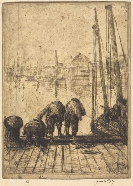Curator: Welcome. Before us is Edmund Blampied's etching, "Ostend Horse," created in 1926. Editor: It’s bleak. Stark. I’m struck by the contrast between the solid darkness of the lead horse and the skeletal rendering of everything else. There’s a heavy sadness about it. Curator: That resonates with the realities of labor, particularly in coastal communities like Ostend during that period. Horses were integral to industry, bearing immense burdens, both physically and economically. Blampied was deeply interested in the impact of these forces on marginalized figures. Editor: I see the horse as a powerful symbol. A symbol of raw animal power, harnessed and subjugated to human will. The chain connecting horse and human forms a potent visual metaphor. But I also sense pride or respect in the animal itself? Curator: Absolutely. It speaks to the deeply entwined relationship between human and animal. Blampied's work consistently depicted rural life, exploring the intersection of human agency and the environment. One must remember that intersectionality wasn't a term used in the 1920's but those relationships between beings in different classes was part of life in both a class and post-colonial sense. Editor: There's an echo of other cultural traditions in how the horses seem to float above their drawn paths. I am fascinated by that tension. It is a dark subject but its symbolic representation opens a path into social memory. Curator: These visual echoes emphasize the enduring narratives of labor, the intersection of power, and the ways in which economic structures can impact both humans and animals, prompting us to think critically about contemporary labor practices as well. Editor: Thank you. Blampied’s creation allows one to think both on its dark terms and the lasting impact of such symbolism today.