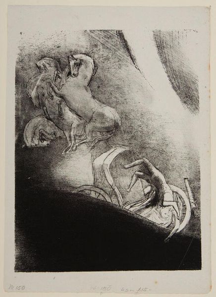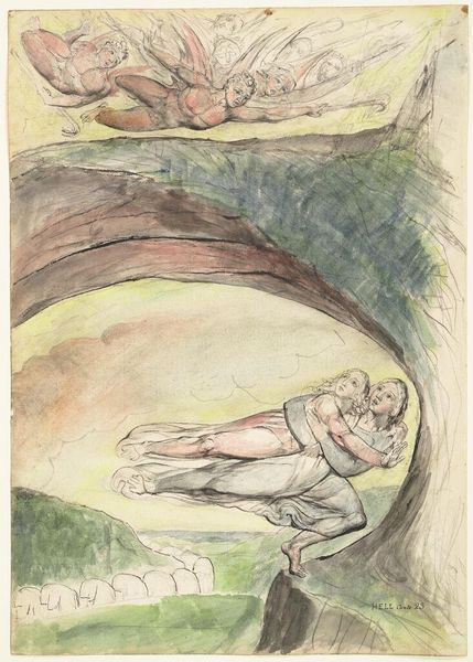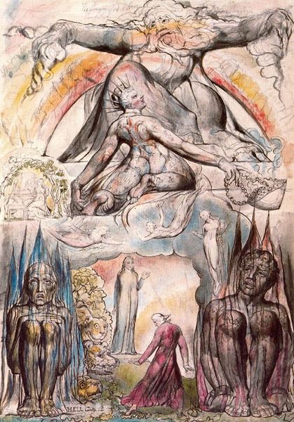 Editor: This is William Blake's "Behold Now Behemoth, Which I Made With Thee (The Book of Job)." It's difficult to pinpoint an exact date, and it appears to be a watercolor. The scene is so strange and evocative. What do you see in this piece? Curator: Blake's work is always an invitation to consider power dynamics. The figures above, seemingly observing, are they complicit in the suffering below? Are the monsters metaphors for uncontrollable forces, or are they symbols of oppression enacted by those in power? Editor: Oppression? I hadn't considered that. Curator: Blake was deeply critical of societal structures. Consider the historical context: Industrial Revolution, social inequality. Are these beasts reflections of those anxieties? Editor: I see it now! Thanks for helping me unpack that. Curator: Understanding Blake requires grappling with the political landscape of his time and how it shapes our interpretation even today.