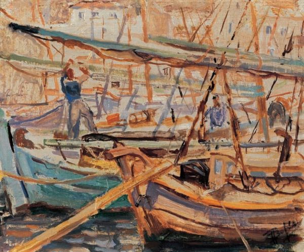 Editor: This is "Constanta," an undated oil painting by Nicolae Darascu. I'm immediately drawn to the way the light reflects on the water and the hulls of the boats. It feels…peaceful, yet active. What do you see in this piece? Curator: I see a layering of cultural memory reflected in the maritime imagery. Water is life, yes? But what else? Notice the boats themselves. Their construction is traditional. They seem almost fossilized, set against the implied modern skyline. It is a meeting place of temporality, is it not? Do these objects resonate as something older? Editor: I suppose they do. The boats have a very worn and used feel to them, certainly not brand new. So, the artist is pointing to a tension between the old and the new? Curator: Exactly. These boats, icons of a past way of life, are tethered, perhaps unable to transition into a changed world. Consider their stillness. Boats are meant to be active in their symbolic construction; freedom, possibility, journey. However, they’re held captive here in their cultural identity, objects more than vessels. Can we even know that they have journeyed to faraway lands? The brushwork itself aids in this sentiment, creating a sense of transience. Editor: That's fascinating. I never considered how the artist's style could influence the meaning. Curator: Style is never separate from subject. What does the rapid movement of plein-air practice elicit in this context, regarding cultural continuity? It begs many questions. Editor: I see what you mean. It’s more than just a pretty picture of boats; it’s about the passage of time and holding onto the past. Thanks! Curator: Indeed, our shared cultural symbols create new layers of significance with each viewing, inviting self-reflection of past, present, and future, simultaneously. It has been a pleasure.
