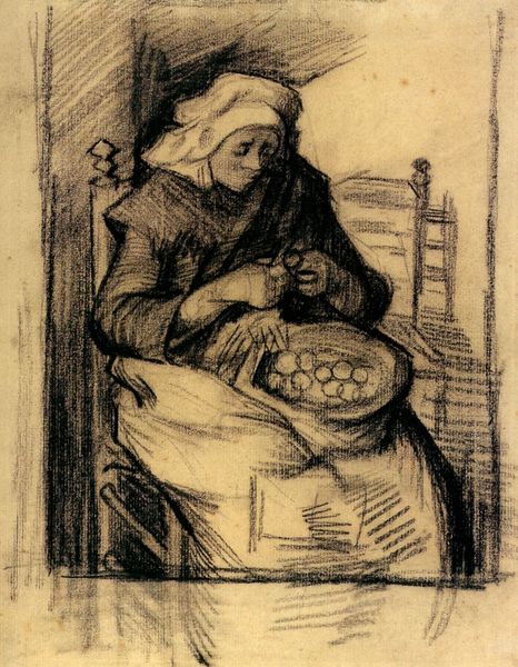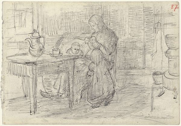 Vincent van Gogh made this drawing using pencil on paper, a method that allowed him to rapidly capture the essence of a domestic scene. The simple material of graphite is used here not for careful rendering but for capturing the rough textures and volumes of the objects. The weight of the iron kettle is palpable, made apparent through the density of the pencil strokes, while the fleeting nature of the fire and smoke are evoked with lighter, more gestural marks. The utilitarian, everyday objects are imbued with a sense of dignity through the artist's focused attention. The labor associated with the objects and the scene – the cooking, the tending of the fire, the maintenance of the home – is subtly referenced through the weightiness of the drawing. By elevating these humble subjects, Van Gogh blurs the boundaries between the fine arts and the crafts of daily existence. In doing so, he invites us to see the inherent value and beauty in the often-overlooked aspects of working-class life.