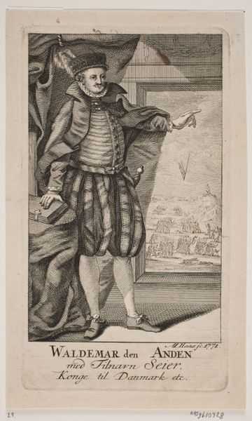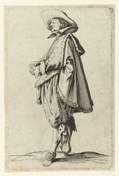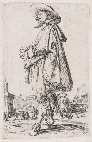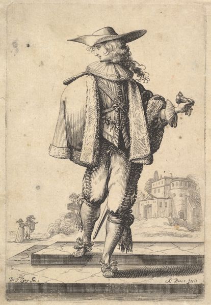 This print, "Copy of Le Gentilhomme aux Mains Jointes", was etched by an anonymous artist, after Jacques Callot, as part of "La Noblesse". The image presents a finely dressed nobleman of the 17th century. This series offers us insight into the self-presentation of the French aristocracy. The nobleman's elaborate attire, including his wide-brimmed hat, fur-lined cloak, and decorative shoes, signals his social status and wealth. The artist uses linear precision to render the details of his clothing, contrasting the figure with the city in the background. Prints like these circulated widely, informing ideas about class and identity. Analyzing fashion plates alongside period texts like conduct manuals or satirical pamphlets, we can get a clearer picture of the social and institutional norms of the time. The politics of imagery are clear, as prints played a key role in shaping and reinforcing social hierarchies.