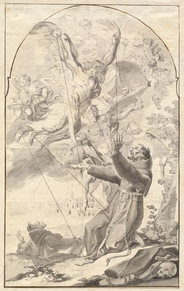This is Pietro Monaco's rendition of 'Stigmatization of Saint Francis,' made with etching in the 18th century. The composition swirls upwards, carrying our eye from the grounded figure of Saint Francis to the ethereal vision above. Note how Monaco uses contrasting textures—rough, earthly rocks against the soft, cloud-like forms—to distinguish the divine from the mortal realm. The stark lines forming the cross and the divine light cut through the swirling scene, punctuating the moment of Francis's spiritual transformation. This work plays with semiotic codes. Light traditionally signifies the divine, while the book held by an angel symbolizes knowledge and revelation. But consider too, how the upward, dynamic composition and the angel's gestures destabilize a fixed, hierarchical view of heaven and earth, suggesting a more fluid interaction between these realms. Monaco’s formal choices invite us to explore the convergence of the physical and spiritual and how the earthly might be transformed by divine intervention.