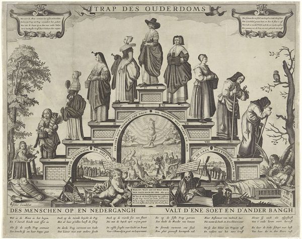 Curator: We are now standing in front of “Trap des Ouderdoms,” created sometime between 1612 and 1652 by an anonymous artist. It's an engraving currently held in the Rijksmuseum collection. Editor: It certainly has an intense, almost unnerving atmosphere, doesn’t it? The way life’s stages are rigidly depicted as steps feels so…controlled and predetermined. The use of line, the stark contrast, lends it an almost harsh quality. Curator: Well, think about printmaking in this period. Engraving was a painstaking, highly skilled craft. The process involved meticulous labor, the precise cutting of lines into a metal plate, the controlled application of ink and pressure. The resulting prints were relatively affordable, making complex allegorical images accessible to a wider audience than painted works could reach. This affected the popular consumption of this visual idea. Editor: Precisely! And consider what's being communicated. We see an allegorical stairway of life here, really reflecting the pervasive "memento mori" theme of the period. It presents life's stages, infancy to death. Look how social commentary on wealth, labour, and morality intertwines with anxieties about ageing and mortality! The composition itself visually reinforces power structures and prescribed societal roles at a given point in time. Curator: Absolutely. The figures stand rigidly on their respective steps, each seemingly consumed by their age-specific activity or condition. The print offers a didactic function, serving as a constant reminder of human transience for its contemporary viewers. This kind of precise craftsmanship meets symbolic, cautionary narratives to comment on life. Editor: The very medium reinforces this idea of predetermined paths; it's as though our fates are etched in ink. In this image we find a powerful reflection on mortality that questions individual agency and promotes a distinct set of societal values. It leaves me wondering about whose norms and beliefs are being propagated through mass reproducibility? Curator: Indeed, engaging with “Trap des Ouderdoms” challenges us to contemplate art-making techniques, social influences, and their effect on society and personal existence. Editor: I agree; confronting themes such as ageing, labor, social structures and the limitations they placed on individual lived experience is something this artwork instills in us.
