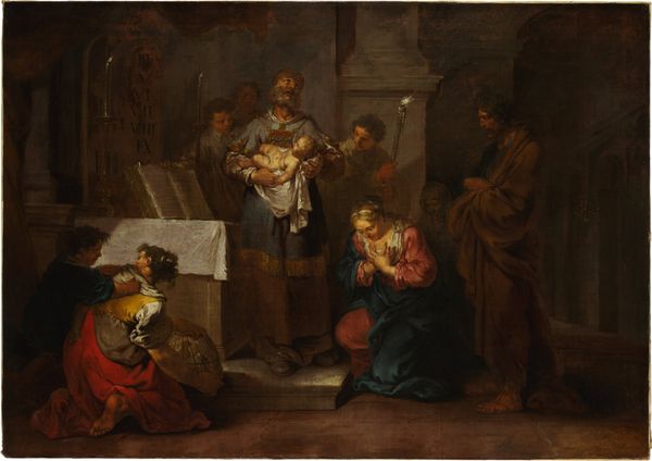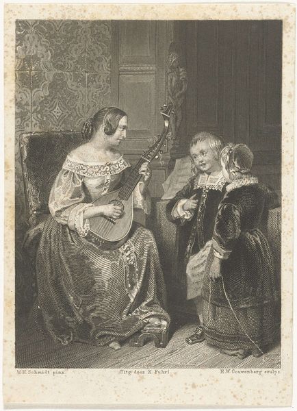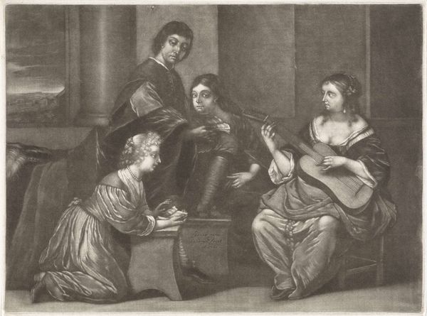 Editor: Here we have "A Woman Playing the Theorbo-Lute and a Cavalier," created sometime between 1653 and 1663 by Gerard ter Borch the Younger, an oil painting currently housed at the Met. There's something so intimate about this scene, but also a bit mysterious... What draws you in when you look at this painting? Curator: Oh, that quiet stillness grabs me every time. I think ter Borch wasn't just painting a pretty picture; he was composing a story, a fragment of a play maybe. Notice how the light gently touches the woman’s face and hands? It’s like he’s saying, “Look closer, there’s something brewing here." What do you make of the Cavalier's pose? Editor: He seems... disinterested? Like he's looking past her, lost in thought. Is it a painting about courtship? Curator: Perhaps. Or maybe about the expectations placed on women of that era. See how meticulously ter Borch painted the textures – the woman's fur-trimmed robe, the patterned rug, the Cavalier's fancy leather jerkin? I bet this painting says just as much about the social class as the personal dynamic. Have you ever felt the same conflicting pull, you know, wanting something to be simple but feeling the pressure to complicate things? Editor: Absolutely. That tension between desire and societal expectation… it's definitely there. I hadn't considered that this wasn’t simply a portrait of musicians. Curator: It’s a peek into a world of controlled desires and unspoken dialogues, a dance between people, all framed in that glorious Dutch light. It reminds me that the quietest moments often have the loudest stories. Editor: It definitely gives a fresh look at historical genre painting and new way to understanding complex societal interplay through the details, subtle gazes, and luxurious textures of ordinary moments.