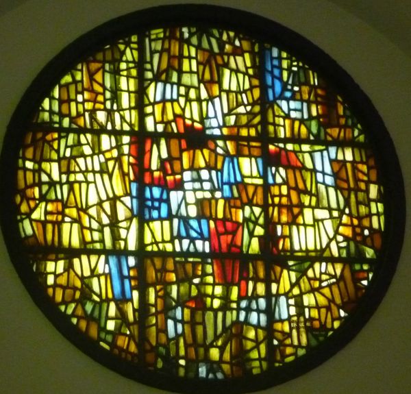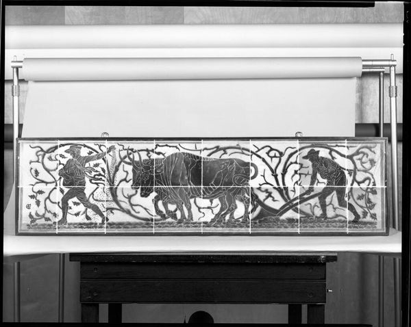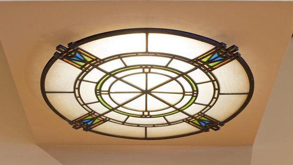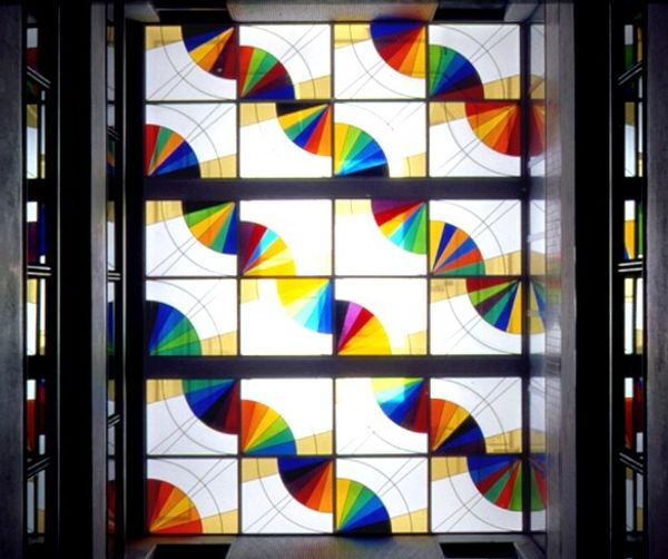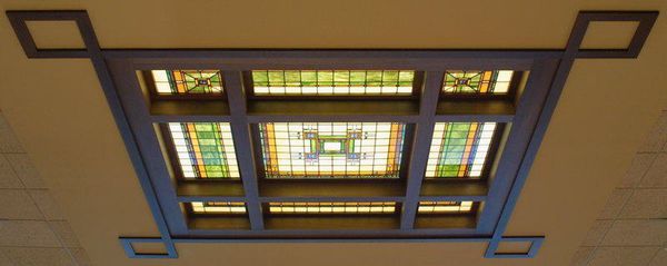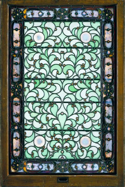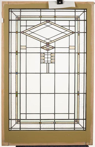 Curator: Here we have a skylight panel, one of a set of six designed in 1913 by William Gray Purcell. It’s currently housed here at the Minneapolis Institute of Art. The panel features a geometric grid holding stained glass pieces. Editor: The light streaming through those glass panes makes the design feel less rigid, more airy, like a geometric garden overhead. It has a beautiful contemplative quality, despite the strong lines. Curator: Yes, Purcell was quite involved in the Prairie School movement. We see a conscious rejection of ornamentation here in favor of clean lines, the structure almost reminiscent of Japanese design. Editor: Precisely! That emphasis on horizontality, the simplification of forms, echoes that sensibility. Squares within squares… the visual echoes create this sense of serene expansion. I see both a modern sensibility but ancient building forms represented in this grid pattern. Curator: The arrangement and the geometric nature align with the Prairie School's social goals too—democratizing art and design by creating beautiful yet functional everyday objects available for all. It spoke of a social utopian ideal. Editor: It's a quiet revolution in design. The subtle colors—the greens, yellows, earth tones, feels organically connected to the landscape beyond the structure, right? How light and color becomes encoded is striking. Curator: Indeed. Purcell's skylight encapsulates the Prairie School's aspiration: creating an integrated art, where aesthetics and ethical intentions unite, enriching ordinary life, connecting humans with the world around us. Editor: Well, looking up at this design does exactly that, even now, after all these years. It elevates your gaze—invites the sublime—through just the simplest of shapes, doesn't it? What could be better? Curator: It is a powerful legacy. Makes you want to spend more time looking up and considering, what new perspectives do these age-old designs invite us to discover?