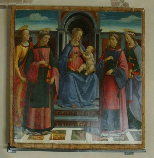 Editor: This is "Jesus among the Doctors of the Temple" by Ambrogio Bergognone, seemingly a fresco. The scene has such a gentle quality, but the architectural setting looks unfinished, almost like a stage. How do you interpret this work from a formal perspective? Curator: Observe how the artist arranges the figures. Young Jesus sits centrally, bathed in a focused light, while the elders and his parents frame the composition, drawing our eyes toward the primary narrative. It seems Bergognone focuses less on strict realism and more on creating a balanced and easily readable composition. Consider the verticality introduced by the arches against the horizontal grouping of the figures; does this contrast enhance or detract from the overall harmony? Editor: I see what you mean about the harmony. Even though it looks unfinished, all the gazes converge on Jesus, unifying the scene. The folds in the clothing are also interesting; they add texture without feeling chaotic. Curator: Precisely. Bergognone masterfully controls the level of detail. Look at the subtle gradations of color in the robes, the economical brushstrokes defining their forms. What about the overall effect of the subdued color palette? Does it suggest a spiritual serenity? Editor: Yes, definitely serene. There's something peaceful and calm about the muted tones that balances with the engaging debate represented. Is this attention to structure a typical aspect of the Italian Renaissance? Curator: Often, yes. Renaissance artists were concerned with balance, harmony, and order. The artist also shows understanding of semiotics, placing characters as if they're acting within a stage that resembles classic art with balanced space. Bergognone’s choices enhance clarity and invite contemplation. Editor: So, by examining the visual organization, color choices, and textures, we can gain insights into Bergognone's artistic intention and period! I really understand his aim to focus on structure and clarity rather than realism. Curator: Exactly. Art reveals meaning through careful construction, through choices made about line, color, and form. And you, as the viewer, now hold the knowledge to actively explore such visual strategies.