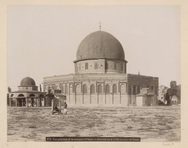 Curator: Looking at this albumen print, made in 1857, one is immediately struck by the incredible stillness of Jerusalem. It is titled "Jerusalem, Site of the Temple on Mount Moriah." Editor: It does possess a rather haunting quietude. All soft browns and beiges… like faded memories clinging to stone. But there’s also something imposing about its structure, despite the warmth. A sense of authority. Curator: Indeed. The photograph’s composition, almost perfectly circular, focuses the gaze directly onto the Dome of the Rock. The meticulous detail afforded by the albumen process captures the intricate architectural nuances. Editor: It is a very picturesque image of what some call orientalism. How might this presentation of Jerusalem's holy sites reflect a Western gaze on Islamic and Palestinian history? Is this a record of a place, or a declaration of a certain cultural perspective? Curator: Well, consider the photographer’s background. We may consider it an artistic expression, rooted in capturing a visual representation of religious and historical significance. Editor: I’d counter that and suggest it invites contemplation regarding access and representation. Who is allowed to document, and whose narratives gain visibility? There's a tension here between a seemingly objective rendering and the inevitable subjectivity inherent in any act of observation. What does it tell us about who controls the narrative of a space so intensely contested? Curator: Fair. Photography itself was still a relatively new medium, finding its place between objective record and artistic interpretation. The framing certainly monumentalizes the Dome, lending it an almost ethereal quality. Editor: Precisely! An ethereal quality born not only from photographic technique but from very distinct ideological motivations that might also reinforce colonial power dynamics, right? Curator: Perhaps. On second viewing I may grant the complex interplay of history, power, and artistic representation you are highlighting in this space, Jerusalem. Thank you for this different understanding. Editor: Anytime. It's precisely this multilayered complexity that makes viewing historical images like these continually compelling!