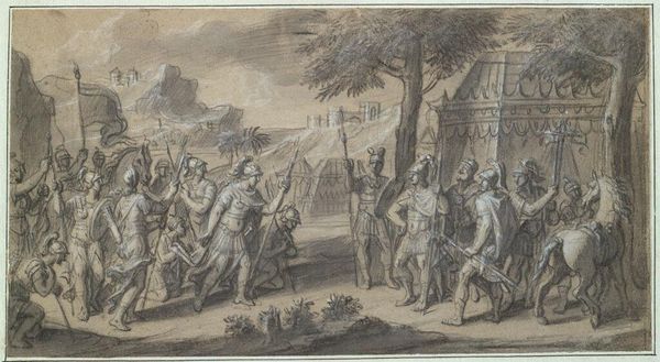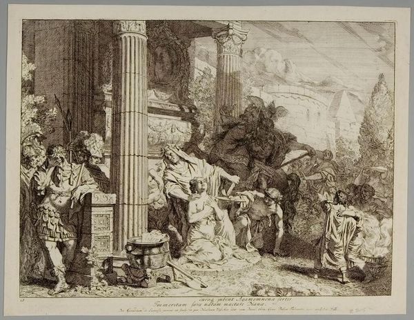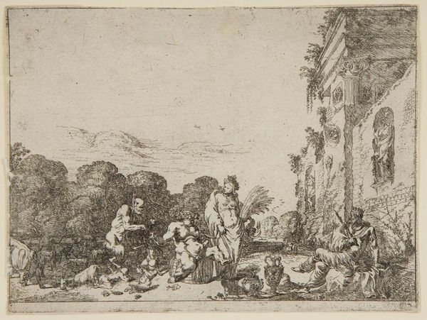 Curator: Here we have “Baptism of Christ”, an engraving by Johannes Glauber dating back to sometime between 1656 and 1726. Editor: What strikes me immediately is the dynamism and asymmetry. Despite being an ostensibly sacred subject, it feels so alive, not static at all! Curator: Indeed. Notice the engraver's expert use of line. Dense crosshatching plunges the gathering of onlookers on the left into near darkness, contrasting with the airy lightness of the angels on the right. It’s a masterclass in tonal variation using solely line work. Editor: That darkness on the left, though, for me speaks to the broader cultural implications. We have a predominantly male gaze represented by this crowd, rendered in a stark, almost critical light. The composition itself seems to suggest a societal skepticism towards Christ’s act, shadowed against a divine moment of grace, highlighted by the angels. Curator: An interesting perspective. However, might we also consider how Glauber manipulates perspectival depth to create dramatic spatial relationships? The strategic placement of the architectural ruins further compresses space, enhancing the almost theatrical quality. Editor: True, and that compression lends urgency. It reminds me how baptism itself was often a highly politicized act during periods of religious and social upheaval. What appears as a serene, spiritual event is loaded with implications of resistance and solidarity. It brings forward narratives often whitewashed from traditional historical depictions of religious rites. Curator: A compelling point. Certainly, reading artwork through social contexts enriches understanding. But I maintain that its artistic power lies fundamentally in Glauber's superb manipulation of Baroque sensibilities and expert deployment of printmaking techniques to tell this familiar story. Editor: Of course. It's in that skillful melding of technique and representation that the potency lies. Considering both formal choices and their reflections on social issues leads us to richer conversations, highlighting art's persistent engagement with the world.