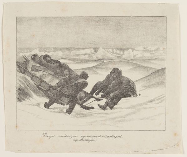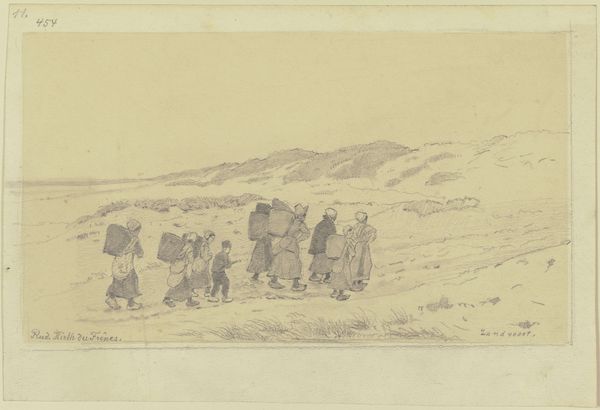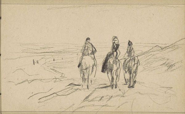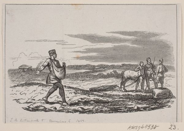 This is an illustration for "The Deaf Wife," an anonymous work held here at the SMK. Its simple lines belie a complex social commentary, common in illustrations of its time. The image presents us with three figures, presumably the husband and his friends, set against a vast, open landscape. The cultural context of 17th-century Europe, particularly in agrarian societies, is crucial here. The landscape isn't just a backdrop; it represents the economic and social realities of the time, where land ownership and agricultural labor defined much of life. The presence of the lone female figure in the background raises questions. Is she the titular "deaf wife?" Is this meant to reflect the isolation and social exclusion of women, particularly those with disabilities? Historical archives, literary texts from the period, and studies on the social conditions of women and disabled persons in 17th-century Europe could further illuminate the role of this art as a reflection or critique of its time.