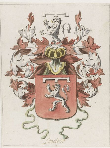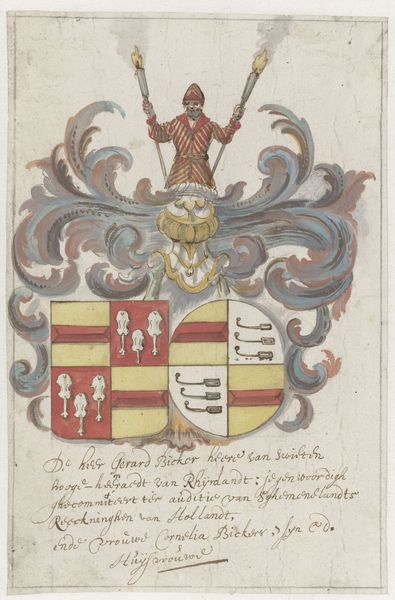 Curator: This intriguing drawing is titled "Wapen van Willem Bardes," dating roughly from 1600 to 1649. It appears to be rendered with watercolor and possibly colored pencil on toned paper. What strikes you first about it? Editor: The overall feeling is ornate, yet oddly intimate. It feels hand-crafted, almost like a personal emblem or a gift, not something mass-produced. The muted colors lend a sense of history and perhaps even melancholy. Curator: Precisely! Consider the material conditions of its making. This wasn't high art meant for a gallery. It's likely a personalized object. The toned paper, watercolor, and coloured pencil point to the relatively accessible nature of its production. It speaks volumes about the emergent possibilities available to someone of a lower status than royalty seeking to emulate such heraldry. Editor: Absolutely. The iconography also reveals status, but in a more symbolic manner. The wreath, held aloft, implies victory or honor, which were clearly of immense social importance. Then, the shield itself—the core visual element. What family narratives are embedded there, and how were those images designed to convey a particular lineage? Curator: I think the curved letter style, along with the flourish and details, also suggest it wasn't meant for wide distribution, thus signifying something very intimate or symbolic within the context of a household, familial object, or business ledger of the era. Editor: And how might that social function have influenced its style? I mean, it almost borders on caricature. The floral embellishments are over the top and the hands look strangely small. The exaggeration in form, and the inclusion of symbolic elements, contributes to an image that walks the line between a formal pronouncement of rank and playful self-definition. Curator: That's the genius of understanding production. The artist had access to methods of crafting but maybe less so to aristocratic standards of flawless depiction. This pushes the materiality itself to carry expressive weight, as a reflection of laboring hands in contact with materials in such early manufacturing settings. It’s incredibly potent! Editor: Incredibly insightful, both of you! It really has encouraged a great understanding.