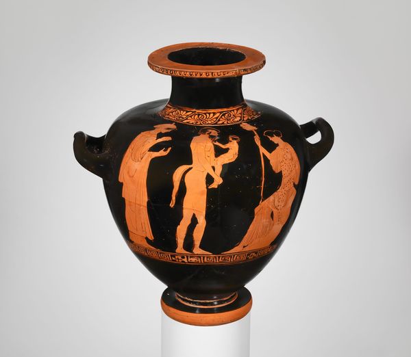 This terracotta kylix, or drinking cup, was crafted by Douris. The cup's interior features a striking contrast between the black background and the figures painted in red. The composition is circular, mirroring the cup's form, with figures arranged around a central space, framed by a decorative border. The figures are depicted with a keen eye for detail, with a focus on the articulation of their musculature and posture. Their gestures suggest an active scene, perhaps depicting daily life. The stark contrast between the red figures and the black background not only emphasizes their forms but also creates a sense of depth and dimension within the shallow space of the cup. The choice of a circular format invites a continuous viewing experience, a full rotation. The images on this kylix aren't just decorative; they are a carefully constructed system of signs that engage with cultural values and social practices.