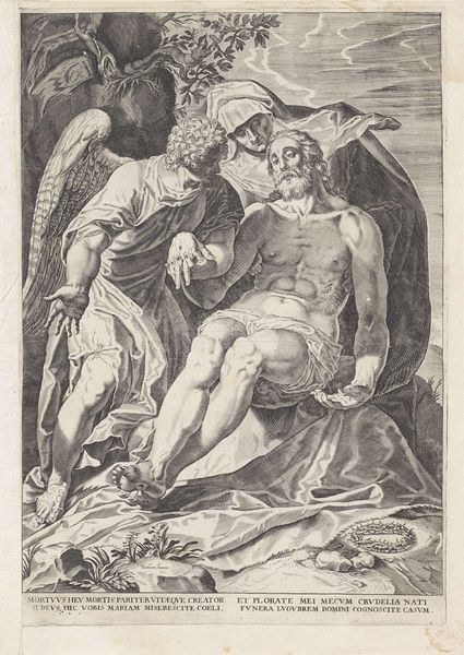 Editor: This is Cornelis Cort's "Tarquin and Lucretia", held at the Harvard Art Museums. The scene is intense, almost theatrical. What compositional elements stand out to you? Curator: Note how Cort employs strong diagonals to convey dynamism and violence, disrupting any sense of static repose. Observe the stark contrast between light and shadow, further heightening the dramatic tension. The positioning of figures creates a visual vortex, drawing the eye to the crucial point of conflict. Editor: That's a really interesting point; I hadn't noticed those contrasting diagonals at first. Curator: Precisely. The artist masterfully directs the viewer’s gaze through calculated manipulation of form and tone, underscoring the narrative's inherent drama. Considering these elements, how might we interpret Cort's artistic intent? Editor: Looking closely at the composition helps clarify the drama and horror of the scene. Thanks for pointing that out. Curator: Indeed. Careful analysis reveals the artist’s calculated orchestration of visual elements, enhancing our understanding of the work.