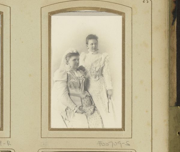 Curator: This albumen print, dating roughly from 1900 to 1914, presents a formal double portrait titled "Dubbelportret van Johanna Cornelia Betz-Beucker Andreae en een vrouw, aangeduid als L.C. van Sloterdijck". The sitters are identified in the inscription. Editor: Oh, there's something so contained about this photograph! Like holding a whispered secret, you know? They almost feel like paper dolls. What are they telling each other without words? Curator: I’m drawn to understanding how photographic portraits during this era helped solidify social roles, particularly for women. In a time when rights were limited, controlled visual representations were a means of staking claims in society. We see it in the detail given to attire and composition. Editor: You're right. The elaborate gowns and serious expressions create a world of etiquette. Still, my mind wanders… were they close friends? Sisters? Did they choose to pose together, or was it a commissioned portrait? There's this invisible story bubbling just below the surface. Curator: Precisely, and perhaps an analysis informed by feminist art history and queer theory allows us to question traditional interpretations of such pairings. The nature of female relationships during this era can only be understood through meticulous engagement with contextual material. Editor: You think about how tightly laced they must be, physically and emotionally. Maybe there's yearning in those tight-lipped smiles? Art has this sneaky way of reminding us that history happened to actual humans, wrestling with life just like us. Curator: Absolutely. Consider how women, particularly in artistic spheres, subverted societal expectations to create alternative communities. The image, while seemingly formal, serves as an entry point to discussing nuanced gendered identities. Editor: It definitely pokes at something…a shared joke they have, a promise between them, perhaps. Seeing the names inscribed so formally makes them tangible after all this time. A moment captured; their reality, still present. Curator: Reflecting on this, it strikes me how a seemingly simple photograph encapsulates so much about the dynamics of gender, class, and representation at the turn of the century. Editor: Yeah, well, now I need to dream up a novel about their lives, right? Gotta give them some joy and intrigue! Thanks for that rabbit hole.
