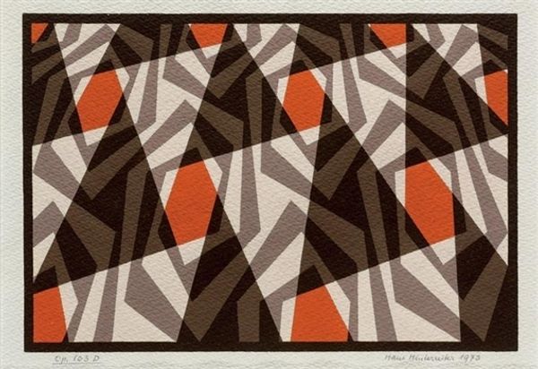 Hans Hinterreiter made this artwork, ME 438, in 1940, using, it seems, fairly simple means. The geometric shapes feel almost screen-printed, with flat, unmodulated blocks of color. This makes me think about artmaking as a process of arranging and layering. There’s something so satisfying about the limited palette here – the red, black, white, and gray working together to create an almost hypnotic effect. Notice how the red diamonds pop against the black and white, drawing your eye into the center of the composition. I'm fascinated by how the shapes intersect and overlap, creating a sense of depth and movement on an otherwise flat surface. It's like Hinterreiter is playing with our perception, inviting us to see the world in new ways. Thinking about other artists, Sol Lewitt comes to mind, who also used geometric forms to create complex and engaging artworks. It’s a conversation across time, where artists build upon each other's ideas, challenging and expanding our understanding of what art can be.