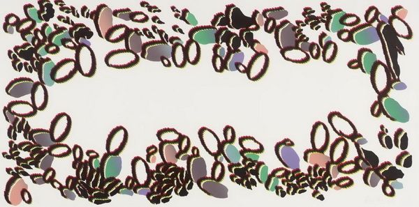 Curator: This is Bernard Cohen's "First Image for J," held in the Tate Collections. It's an intriguing piece. I am immediately struck by how the floating shapes are positioned. They seem to evoke a ceremony. Editor: Indeed. What I find compelling is Cohen's process. The labor involved in creating those repeated forms across the surface. I wonder about the tools he employed. Curator: To me, the shapes themselves, clustered in that arc, almost feel like figures in an ancient ritual. Do you see a symbolic connection to cyclical patterns? Editor: Possibly, but consider also the material context. Was this produced for mass consumption, or was it a commentary on the commodification of art itself? Curator: It's a fascinating tension between the artistic intention and the potential symbolic interpretations. Thank you for pointing that out. Editor: And thank you for highlighting the image's potential cultural weight, its symbols, which invite us to delve deeper.