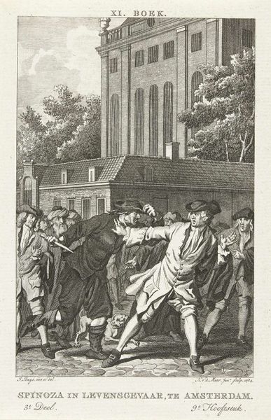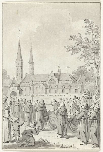 Curator: This engraving, residing here at the Rijksmuseum, is titled "Begrafenis van heilige Jeroen van Noordwijk te Egmond, ca. 983-988." It was created by Reinier Vinkeles sometime between 1780 and 1795. Editor: It strikes me as quite somber. The high contrast, almost monochromatic palette amplifies the solemn procession. The church in the background has a somewhat imposing and austere feeling. Curator: Indeed. Vinkeles was working during the Neoclassical period, which explains the interest in historical subjects and the relatively clear, almost architectural depiction of the scene. It speaks to an increased academic interest in national history at the time, a way of legitimizing political power through visual narratives of the past. Editor: You're right, there’s definitely a studied feeling to the composition. Notice the consistent appearance of crosses in this work: on the tops of the church spires in the background and those being carried by members of the procession itself. It creates an immersive visualization, one filled with Christian symbolical elements. This repetition signifies its sacredness and unifies the image, drawing the viewer’s attention to the Christian faith at the heart of the work. Curator: Also the almost performative gestures of some figures emphasize key narrative moments. Some kneel; a child reaches out seemingly to the coffin, perhaps conveying both reverence and a moral lesson for viewers of the time about faith and death. This connects the depicted scene of St. Jeroen’s funeral with its moral reception, influencing societal expectations. Editor: Precisely! It's interesting how Vinkeles uses the architectural setting to add weight to the historical moment depicted, while at the same time using culturally recognizable symbols, the cross most significantly, to instill Christian themes and impart greater cultural significance. Curator: Reflecting on this work, it is crucial to appreciate its role in visualizing and disseminating specific interpretations of history, effectively influencing the political imagination of its viewers. Editor: Yes. Ultimately it brings us back to the ways symbols endure—transforming from signs of faith to signifiers of cultural heritage, always resonating across time.