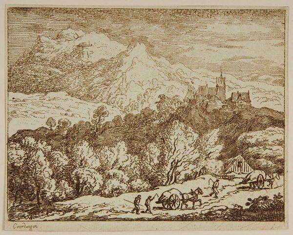 Curator: This is Allart van Everdingen's print, "Two Carts." The piece resides here at the Harvard Art Museums. Editor: It has a rather bleak tone, doesn't it? A stark contrast between the monumental landscape and the small figures toiling below. Curator: Observe how Everdingen uses line to delineate form and texture. The cross-hatching in the sky creates depth, while the delicate lines capture the foliage. Editor: And what of these figures? Consider their labor. It suggests a system where human effort is dwarfed by nature's scale and the demands of survival. Who benefits from this labor? Curator: Functionally, they create balance in the composition, leading the eye deeper into the scene. The stark contrast is striking. Editor: Precisely, and that contrast highlights societal imbalances, the uneven distribution of resources and power inherent within the landscape itself. Curator: A fitting reminder that art can be appreciated on multiple levels. Editor: Indeed, from form to socio-political context, a work offers a wealth of insight.
