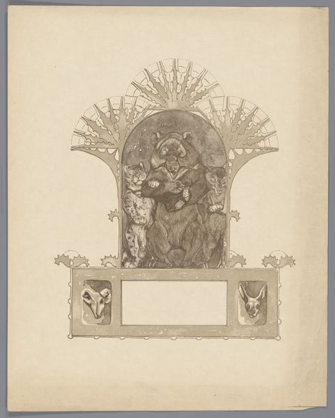 Curator: This ink drawing, made around 1910, is titled "Luipaard, beer en wolf (Firapeel, Bruun en Isegrim)," and it's attributed to Bernard Willem Wierink. What are your immediate thoughts? Editor: It has an undeniable Gothic darkness. I’m drawn to the texture created by the pen work, but also a little disturbed by the intensity of the animals' expressions. Curator: Yes, the piece has strong Symbolist overtones in its figuration. Observe how the artist employs ink to produce both delicate lines and heavier shadows, achieving a nuanced interplay of light and dark. The composition, too, is notably framed; the upper register feels almost architectural. Editor: The method is fascinating. It makes me wonder, was Wierink using a quill or a more modern pen? And where would the paper have been sourced at the time? These are, of course, loaded characters, aren't they? Was this designed as an illustration or a presentation piece? Curator: Function is difficult to be certain about here; this kind of symbolic form was meant to tap into a realm deeper than direct communication. The artist is manipulating the structure to evoke emotion more than impart pure representation. Consider, also, how Wierink utilizes the varying thicknesses of line to generate visual weight. Editor: Absolutely, and these characterizations, I wonder if this depicts figures from folklore? How does this particular narrative then play into the historical context of the piece being made and what sort of social function would these animals fulfill? Curator: You are astute to consider the narrative function within the sociohistorical context, the employment of these figures certainly echoes a tradition of bestowing morality lessons, particularly ones centered on ideas around civilization and barbarity. I'm very grateful for your point about context. Editor: And I value how you call my attention to the composition. Together, I think we can appreciate not only the intrinsic skill but also what it contributes to a richer understanding of its function and place in art history.