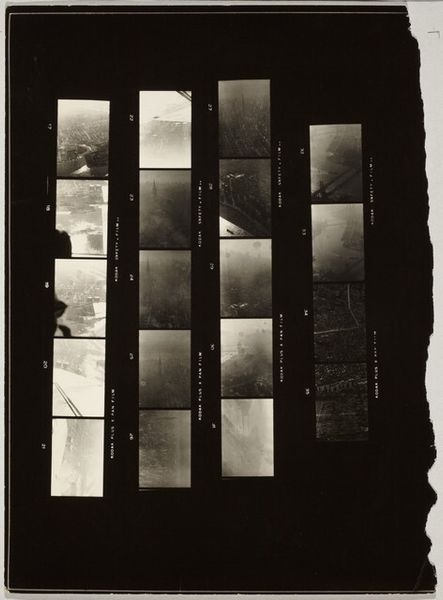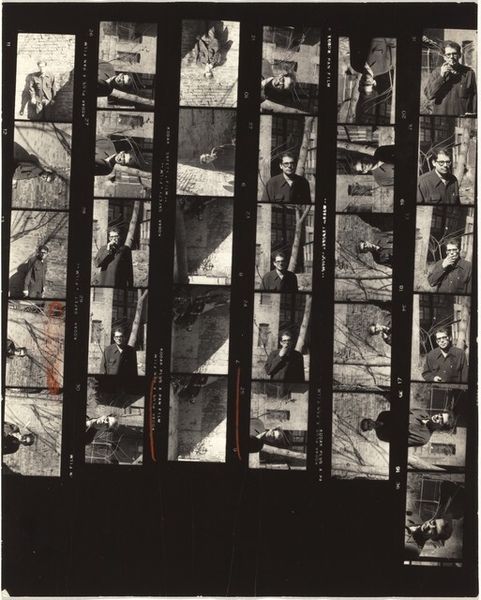 Editor: Robert Frank's "Staten Island no number," from April 1962. It’s a gelatin silver print that captures a sequence of images within a film strip, but then is printed, isolated on a black ground. The contact strip format draws attention to the process. What are your thoughts on this artistic choice? Curator: Indeed. By foregrounding the materiality and sequencing inherent in photography, Frank directs our attention to the formal elements of image-making itself. Note the contrasts: the crisp edges of each frame versus the ambiguity of the black void surrounding it. The granular texture further emphasizes the indexicality of the medium. Editor: It almost feels like he is deliberately not trying to tell a complete story. Curator: Precisely. He presents fragments, asking us to consider the relationships between them not as narrative progression but as formal echoes and visual rhymes. Consider how the tonal range shifts between frames. What might that variation signify in relation to the whole? Editor: So, instead of looking for a specific story, we should think about the changing forms and contrasts within the strip? Curator: Precisely. Frank invites us to see not a depiction of Staten Island, but a study of photographic language—its structure, its rhythm, its potential for meaning independent of subject matter. Editor: That definitely changes how I view this work. The emphasis on form is quite revealing! Curator: I agree. It's in these deliberate arrangements that Frank's compositional genius shines through.