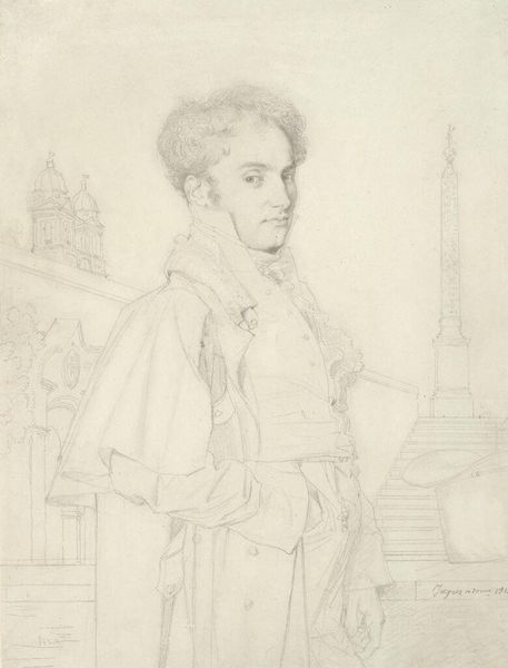 Editor: Here we have Ingres’ pencil drawing of Merry-Joseph Blondel, created in 1809. There's an incredible stillness and formality to it. I can’t help but wonder, what's your read on this piece? Curator: For me, this drawing shimmers with a certain reserved intensity. It's a portrait, yes, but almost a ghost of a portrait – so finely rendered it almost evaporates off the page! Imagine Ingres, capturing Blondel in Rome. Both young artists, both swimming in the same Neo-Classical currents, each grappling with the legacy of antiquity. And there, looming in the background, sketched almost as an afterthought, the faint lines of a Roman building—perhaps a nod to that shared inspiration? Editor: It definitely adds a layer, hinting at something bigger. The architectural element isn't super prominent though, so I read the figure first. Did Ingres always capture sitters with such focused detail, or is there something special about his approach here? Curator: Ingres certainly had a sharp eye; his portraits always reveal as much as they conceal. Note the incredible delicacy of the pencil strokes, building up the form in subtle gradations. It’s a masterclass in restraint and precision. He's not just recording a likeness but almost an ideal, wouldn't you agree? A Neo-Classical ideal of masculine beauty, perhaps? Editor: Absolutely. It feels more "perfected" than realistic, maybe idealized as you say. Something about how smooth his face is compared to the light sketchiness everywhere else. This was done early in Ingres's career, wasn't it? Curator: Quite early! He was a hungry, ambitious young artist, soaking up the Roman atmosphere. Perhaps this Blondel is more than a portrait… perhaps it's also a statement of intent? Look at how the very precision hints at a grand career to come. And that's exciting! Editor: Thinking about it as a "statement" really makes me look at the drawing differently. All that latent potential! Curator: And there you have it - the magic of art. We come seeking answers, and leave with even more beautiful questions.