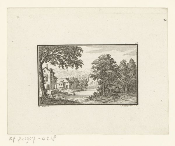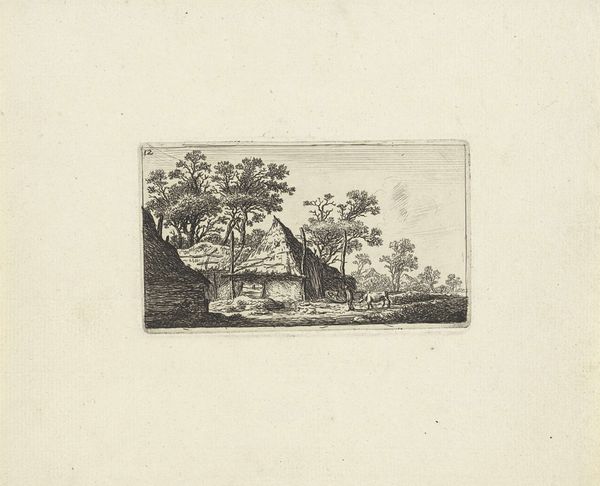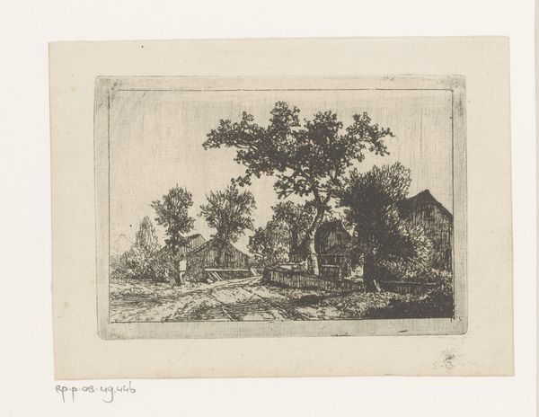 Editor: Here we have "Landscape with Farmhouse and Fence" created around 1786 by Hendrik Schwegman. It’s an etching, quite small and delicate. I’m immediately struck by the somber mood; everything feels muted. What captures your attention in this work? Curator: Muted is a perfect word. For me, it's the masterful balance between light and shadow, achieved through the etching technique, that's really speaking. It's not just about depicting a farmhouse; it's about evoking a feeling, a quiet contemplation. Look at the textures in the trees. Aren't they remarkably evocative? Almost dreamlike... Do you get a sense of a specific time of day? Editor: I do – a late afternoon perhaps? The shadows seem long, stretching from the farmhouse and the fence. I also like the old engraving style that makes you travel back in time, maybe? Curator: Absolutely. It pulls us back to that time through those darks and lights and to that precise location; almost like it's an invitation. Now imagine standing there in Schwegman’s shoes…the air, the sounds… Perhaps you find yourself wanting a moment of solitary reflection like the artist might have been pursuing. Editor: It is such a different sensibility than today's artistic visions, when everyone tries to be bold and avant-garde. Thanks, it’s great to be given a permission to stop and contemplate, it helps calm the storm within me. Curator: The piece resonates long after you've moved on, doesn't it? Sometimes, that is the true genius of an artist.