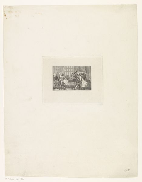 Curator: Well, isn't this a peculiar little scene! Before us, we have "Eetkamerinterieur met edelman die een stoel aanbiedt aan een Romeins standbeeld, drie andere mannen kijken bang toe", created in 1813 by Jean François Ribault. It's an engraving, depicting, as the title suggests, an interior scene with… quite the interaction unfolding. Editor: Right! My initial impression is pure theatrical tension. You've got this dramatic lighting, the classicism in the statue contrasted with the implied narrative unfolding with all these guys reacting. It feels like a play frozen mid-act, or maybe the kind of moment when someone tells a bad joke. Awkward, just really awkward. Curator: Absolutely. It is pulling on some potent strings of visual storytelling. Note the statue; Roman sculpture experienced a huge resurgence, of course, as a central feature within Neoclassicism. This noble offering the statue a seat could signify several things. Editor: Oh, definitely! I wonder about what that gesture of offering a chair truly means. Like, is it hubris? Or mockery? Is it like trying to relate to an unreachable ideal? It is also kind of funny, which I don't think should be discounted here. Curator: Good point. Laughter has always been the great disruptor of authority. And in the aftermath of the French Revolution, people's relationship with icons and idols, ancient or otherwise, became understandably complicated. To kneel, to bow, is this deference, or is something else in play? And those frightened expressions around the table... What fears or transgressions does the statue embody for them? Editor: Makes you wonder, doesn’t it? Especially that off-kilter balance of reverence and potential ridicule! Like, who decides what gets honored and how? How can an image alone elicit fear from those witnessing such an absurdity? I'm definitely seeing echoes of Don Quixote tilting at windmills in this bizarre image. Curator: I see that connection. And it really makes you think about how images accumulate meanings. Over time, icons shift depending on the culture perceiving them. This piece isn’t just about the classical past; it’s a snapshot of a very specific cultural moment, grappling with legacy and revolution. Editor: Definitely! Thanks for shining light on the undercurrents—it is really bizarre to see, yet also so telling of how cultural images get loaded up and re-imagined across eras. Curator: My pleasure.
