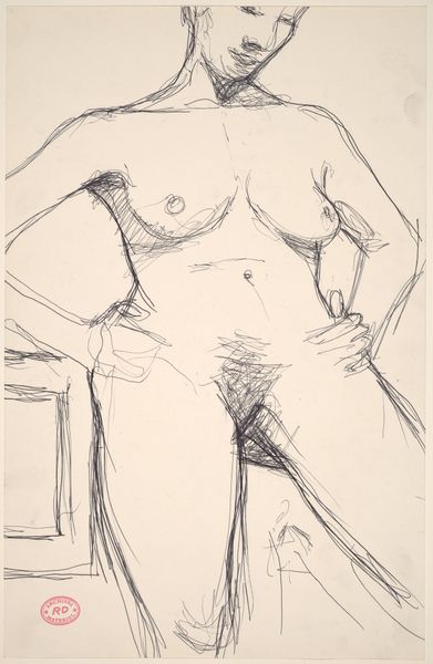 Curator: Let’s discuss Richard Diebenkorn’s "Untitled [female nude with right leg on chair]," an ink drawing created sometime between 1955 and 1967. Editor: It has a raw and honest feel. The simplicity of the line emphasizes the contours and the gestural quality evokes a sense of immediacy. I want to know about the ink and the paper itself. Curator: Note the economy of line, creating form and volume with minimal means. The use of negative space becomes as crucial as the drawn lines, participating in defining the figure. Editor: Indeed. It seems that a minimal approach highlights the nature of the support used for the work; the smooth, cream-colored background almost softens the blunt, quick markings. I imagine that the artist appreciated a support with minimal texture to make it easier for the ink to settle on its surface. Curator: Think about the planar construction within the figure, particularly in the way Diebenkorn models the back and shoulder. It is reminiscent of certain cubist approaches where forms are broken down and reassembled to create a sense of depth and perspective. Editor: How interesting it is that such simple materials of production – ink, paper – provide access into complex systems such as planar construction! It prompts me to think more broadly about how value and worth gets ascribed to certain materials while others are ignored. Curator: The open-ended composition encourages an ongoing interaction and participation with the form. Editor: What strikes me most is how, even in its seeming incompleteness, this drawing offers a sincere meditation on labor, form and the quiet energy found when the two engage. Curator: Thank you. With careful observation and analytical attention, Diebenkorn has opened a path into aesthetic discovery. Editor: I agree, by seeing the simple lines that render it we can better question the social life that animates art as a whole.