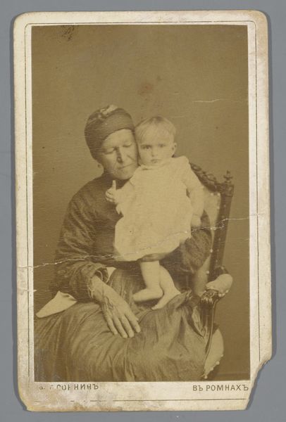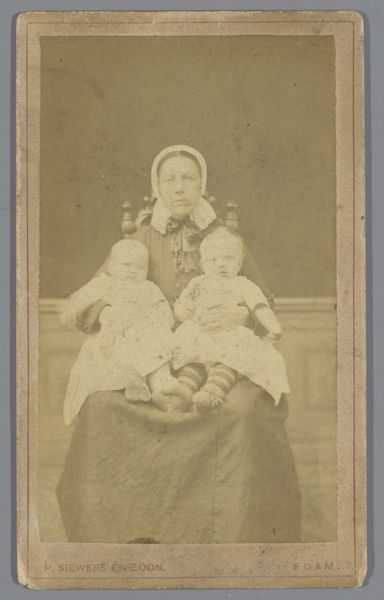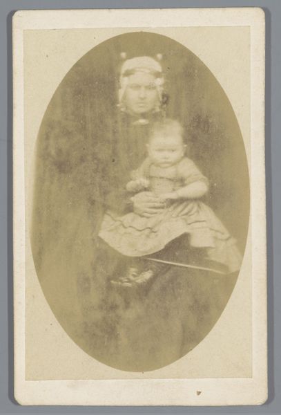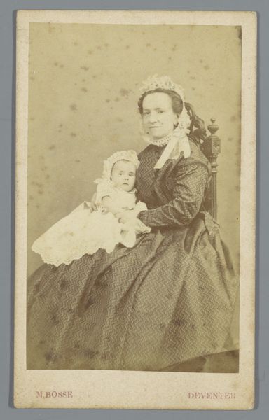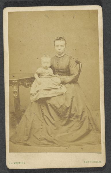 Curator: Here we have "Portret van een onbekende vrouw met een kind op schoot"—that is, "Portrait of an unknown woman with a child in her lap"—an albumen print likely dating from 1871 to 1882. Editor: My first thought is how formally posed the subjects are. Everything, even the lighting, feels deliberate, as if striving for a timeless ideal of motherhood. Curator: Indeed. The very medium—albumen print—speaks to that deliberate approach. Think of the process involved, the careful coating of paper with egg whites... Each step demanding a craftsman's attention. It signifies status. Editor: And a certain type of control over the image. There's an undeniable relationship between the economic status required to produce such a photograph and the constructed, idealized representation it conveys. What I am getting from this piece is the idea that, while the image might show a tenderness in appearance, it mainly portrays an exercise of power and class. Curator: I can see that. The very stillness lends itself to such interpretations. I also feel how images from this era participate in the Victorian obsession with capturing likenesses, as well as symbols of familial continuity and heritage. Editor: The dress, too, points to that sense of curated identity, as it has simple but clear decorations. Three darker strips are displayed close to the base. But it's not just about capturing a person, but a type, a social position that one desires to signal as theirs. What do you read from the flower near the women's collar? Curator: Ah, the flower! Given the context and era, a flower can be interpreted as both symbol of love, hope, and innocence, as well as an element of memento mori: an encouragement to reflect on mortality—heightened even by the young age of the child. The delicate state of that bloom mirrors the fragility of life, urging us to treasure these fleeting moments. Editor: Perhaps... but isn't it fascinating how the material reality of photography – the albumen, the collodion, the darkroom processes - intertwines with these lofty ideas about love and mortality? This image then really encapsulates the confluence of artistry, craft, and commercial drive inherent in 19th-century photography. Curator: It certainly gives a deeper sense of how much work images carry to future generations. Thank you. Editor: Thanks to you! It always good to stop and think what went into these portraits and images.