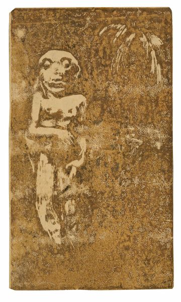 Curator: Ah, "Oviri (The Savage)" by Paul Gauguin, dating from 1894-1895. This impression is an etching in shades of brown, powerfully evocative. Editor: Good lord, that face is arresting. A strange blend of human and something… other. There's a disquieting power to it. It feels primordial, like some ancient deity emerging from the earth. Curator: Indeed. Gauguin employs a restricted palette here, almost monochromatic, which amplifies the subject’s stark presence and focuses our attention on the figure's unsettling visage. The textured surface, achieved through the etching process, lends a tactile quality to the piece. Note the contrasting textures between the figure and the background vegetation. Editor: The background almost feels like a shroud, or maybe the steam of a jungle, obscuring and enclosing. Is it me or does the whole thing feels claustrophobic, feverish? It's like she's birthing herself from the land, or the land is claiming her back. And those blank, staring eyes... Curator: It reflects Gauguin's interest in representing primal femininity and exploring themes of life and death, creation and destruction through a mythical lens. It synthesizes the female form and pagan idols, as he strived to challenge established Western conventions of beauty and identity, particularly in response to his experiences in Tahiti. The title, "The Savage", also forces a re-evaluation. Who exactly is savage, the colonizer or the colonized? Editor: So true! And that tension hangs in the air, thick as the Tahitian humidity I’ve only ever dreamt about. It’s about beauty but also grotesqueness, about the ‘noble savage’ and something darker. This etching really encapsulates those post-colonial anxieties… maybe intentionally. It leaves me with more questions than answers. A wild, compelling piece. Curator: Indeed. Gauguin challenges the viewer with a nuanced interrogation of both self and society. Thank you. Editor: Thanks to you too. A challenging look back.