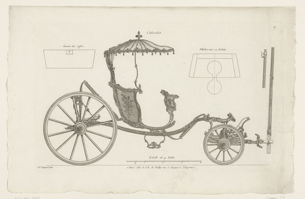 This print, ‘Sociable #557’ of indeterminate date, presents a side view of a carriage on a rectangular sheet. The composition emphasizes line and form over depth, creating a flattened, diagrammatic effect. The carriage is rendered with meticulous lines in black, red and yellow, against a neutral ground. The wheels, rendered in red, provide a vibrant contrast to the otherwise muted palette. The interplay of straight and curved lines articulates the mechanical and decorative elements of the carriage, inviting an examination of design and function. The artist destabilizes traditional modes of representation by presenting the carriage as a set of abstract forms, challenging the viewer's expectations of perspective and realism. The title, handwritten inscription, and the serial number point to a system of classification and standardization, indicative of a culture consumed with categorizing and controlling its environment. The linear precision and formal arrangement invite reflection on the interplay between artistic representation and industrial design.