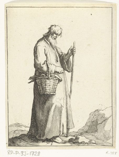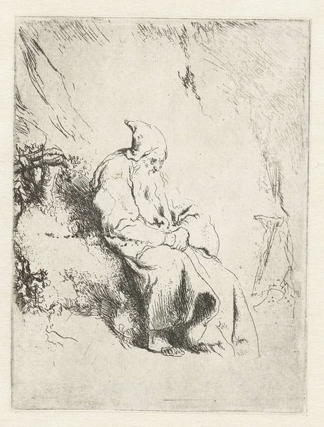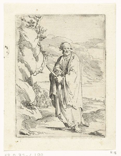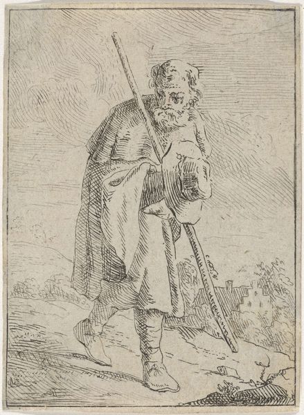 This image, “Andreas,” was made by Andries Both, likely in the 1630s, using a printmaking technique called etching. This detailed work on paper begins with a metal plate, likely copper. The artist would have coated the plate with a waxy, acid-resistant ground, then used a sharp needle to scratch away the coating, exposing the metal. Next, the plate was submerged in acid, which bit into the exposed lines, creating grooves. These grooves hold the ink. The plate is then cleaned, inked, and pressed onto paper, transferring the image. Both’s skill is evident in the fine lines and details he achieved. Notice how the cross-hatching creates a sense of depth and shadow, particularly in the figure's robes. It is a relatively indirect process, yet it has a graphic directness and a gritty feel. The print is not just an image, but a product of labor, skill, and material interaction, bridging the gap between fine art and craft.
