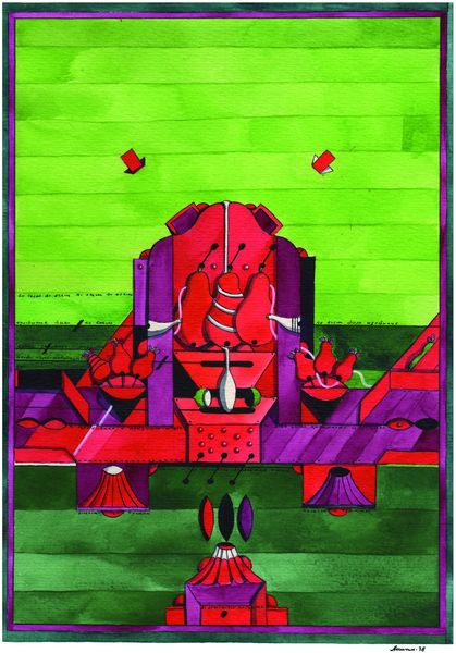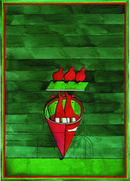 Oleksandr Aksinin made this "Canonical Image" with what looks like watercolor and ink on paper. The purple background is laid down in horizontal stripes, like a stained wood panel, and then this odd little contraption is placed on top. The forms are outlined in hard black lines, and then filled in with these radiant, clashing yellows, oranges and reds. It is like looking at a diagram for a machine that has no function, or maybe a very strange one. Like art, maybe? Look at how the orange pears float above the rest of the structure. The colours are translucent, luminous. Aksinin doesn't seem too concerned with accurate perspective. The whole picture has a beautiful, naive quality, like a cross between a religious icon and a cubist still-life. I am reminded of the work of Paul Klee. Both Klee and Aksinin create their own worlds through personal symbols and forms. They make art that invites you to slow down and embrace ambiguity.