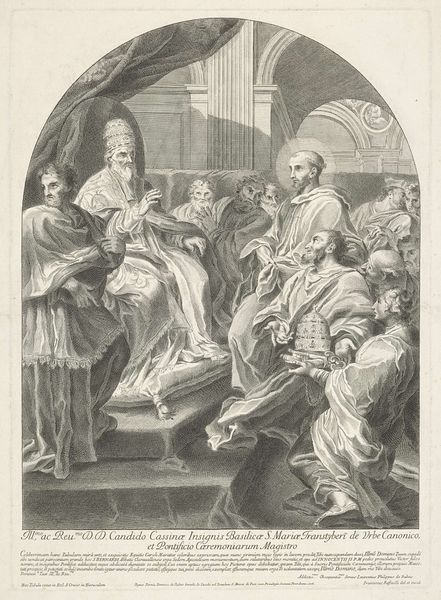 Gerard de Lairesse created this print, titled "The Young Jesus, with Joseph, Mary, and Anna," using etching. Here, the dominant gesture is the raised hand of young Jesus, a symbol deeply rooted in religious and cultural contexts. This gesture appears across millennia, from ancient orators to Byzantine mosaics, signifying teaching, blessing, or divine authority. Think of similar depictions of philosophers and gods throughout the ancient world. Note, this particular image evokes a potent mix of innocence and preternatural wisdom in Jesus. This is akin to the psychological space where childhood curiosity meets profound understanding, engaging viewers on a subconscious level. The raised hand is not static; it evolves. From a symbol of imperial power in Rome, it transforms into a sign of spiritual guidance in Christian art. This cyclical progression shows how symbols resurface, evolve, and gain new meanings across historical contexts, revealing the enduring human need to visually express complex ideas.