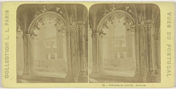 Curator: This stereoscopic collotype presents the fountain within the cloister of the Jerónimos Monastery in Belém, Lisbon, dating between 1868 and 1890. It gives an ethereal, almost haunting view. Editor: It does. I'm struck by the muted tones; the details of the stonework are somewhat lost in the reproduction, lending the scene a dreamlike, removed quality. I wonder about the production; how does this photographic print affect the architectural space it depicts? Curator: Precisely. In the latter half of the 19th century, architectural photography like this played a critical role in shaping European understanding of its historical identity. The image’s wide circulation bolstered Portugal's image as a nation defined by its rich heritage. This was vital amid complex political landscapes. Editor: It's fascinating to consider this as a commodity, designed to project a particular national image. Looking at the cloister, the focus on craftsmanship - each stone meticulously shaped by skilled labor - stands in stark contrast to the mass-produced nature of collotype printing. I'd like to see how those hands transformed raw material. Curator: A good point. There’s an implicit tension here. This very modern reproduction technique puts the medieval era on display for a burgeoning tourist market. That fountain became a signifier; Portugal sold off relics like this while aiming for industrial and political ascendancy. Editor: It's intriguing to imagine people holding this stereo card, peering into the past as if it was in the palm of their hands. This monastery, then, and even now is less of a site of spirituality than a carefully presented product. Curator: Indeed, an artifact that participates in a visual dialogue defining cultural status and canonizing it through institutional power. The careful staging in this shot becomes incredibly significant. Editor: Seeing it this way provides valuable nuance on our concepts of cultural relics. It’s been a very thought-provoking exchange. Curator: Agreed. Understanding how these images functioned then offers invaluable insight on the continuing relevance of architecture in today’s cultural heritage.