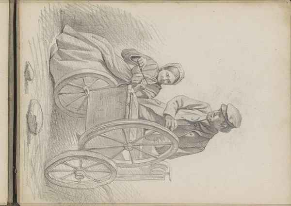 Alexander Ver Huell made this pencil drawing, titled 'Four Students in a Carriage', sometime in the 19th century. The artist's hand is evident in the subtle gradations of shading that model the forms, imbuing the scene with a sense of light and atmosphere. Pencil, as a medium, lends itself to both quick sketches and detailed studies. Here, Ver Huell seems to have used it to capture a fleeting moment, the casual interaction between the students contrasting with the formality of their transport. But beyond the surface, the drawing offers a glimpse into the social fabric of the time. The carriage itself is a product of industry, requiring skilled craftsmanship in woodworking, metalworking, and upholstery. The attire of the students and the driver suggests a certain social class, supported by a system of labor and production. Paying attention to the materials and processes behind an artwork allows us to understand its cultural significance more deeply.