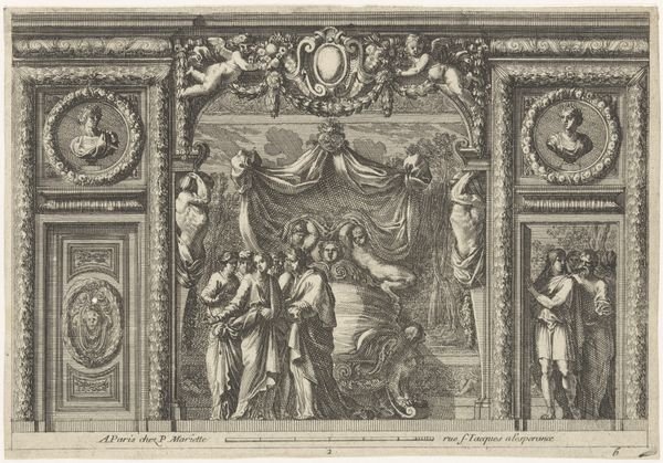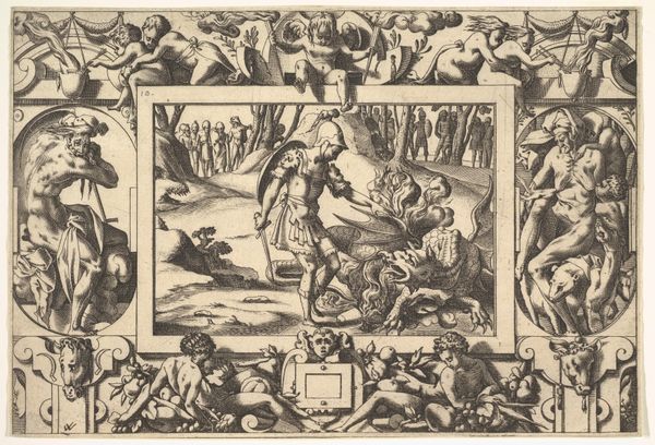 Curator: This is René Boyvin's "Jason bemachtigt het gulden vlies," or "Jason Acquires the Golden Fleece," created in 1563. It's an engraving, currently held at the Rijksmuseum. Editor: It feels so incredibly detailed, almost overwhelming! The use of lines and shading creates a powerful sense of depth, and I am also very drawn by its mythological subject matter. How do you even begin to unpack something like this? Curator: We begin, as always, with form. Notice the rigid frame structuring the scene, filled with ornamentation such as ox skulls, nude figures, and children; this contrasts with the organic quality of the figures populating the inner scene, as well as the natural landscape where the event occurs. Do you see how Boyvin has compartmentalized the space? Editor: Yes, now I see that, how there's like, the main scene, then almost these architectural frames containing supplementary elements. But how do those outer elements affect our reading of Jason’s story? Curator: They offer a commentary. Observe the groups of nudes – their poses are very studied, classical, almost sculptural. Do you note any echoing gestures or contrasting placements among them, maybe mirroring, inversion or reversal that emphasizes compositional structure rather than narrative coherence? Editor: Well, some of the figures echo the action within the main scene – there's definitely an intent to create compositional harmony. So, by looking at formal structure and repeated motifs, you are implying it enhances the classical theme portrayed here? Curator: Precisely! By controlling these contrasts and visual relationships within this detailed organization of figures, textures and tones, Boyvin focuses us on beauty of artistic form itself. What do you take away from this more abstract viewpoint? Editor: This emphasis on visual structure gives me a totally fresh way of viewing artwork that emphasizes composition. Instead of thinking of historical context primarily, I can view formal elements just as importantly. Curator: Precisely! A balance of narrative and art.