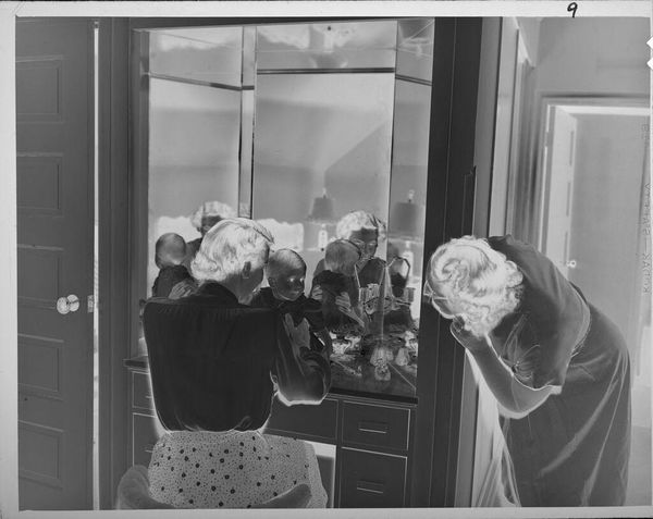 Editor: This is an Untitled photograph by Lucian and Mary Brown, showing a little girl at a vanity. It's quite small, only about 4 by 5 inches. What strikes me is the detail captured in the negative. What does the process tell you about the Browns' artistic intentions? Curator: The material quality of the photographic negative itself is key. Its reproducibility speaks to a specific mode of production, a way of making images accessible, perhaps for mass consumption. The Browns, through their chosen medium, engage in the democratization of portraiture. Editor: So, it's not just the image, but also the means of its making that holds meaning? That gives me a lot to consider. Curator: Exactly. Thinking about the physical object and its capacity for dissemination shifts our understanding of its artistic value.