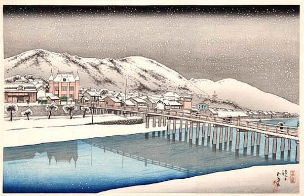 Hasui Kawase produced this woodblock print titled "Evening Snow at Terashima Village". This image is part of the Shin-Hanga movement in Japan that revitalized traditional ukiyo-e art, which had become stagnant. This piece combines the old style with modern subjects. Terashima Village is depicted in a way that might seem nostalgic, contrasting it with the rapidly modernizing Japan of the early 20th century. The inclusion of telephone poles highlights a tension between tradition and modernity. Kawase was a student of Kiyokata Kaburagi, who taught him traditional Japanese painting. You might look at the prints of Hiroshige and Hokusai to see where Kawase's artistic heritage comes from. The study of social history encourages us to understand art not just as aesthetic objects, but as documents of cultural change.