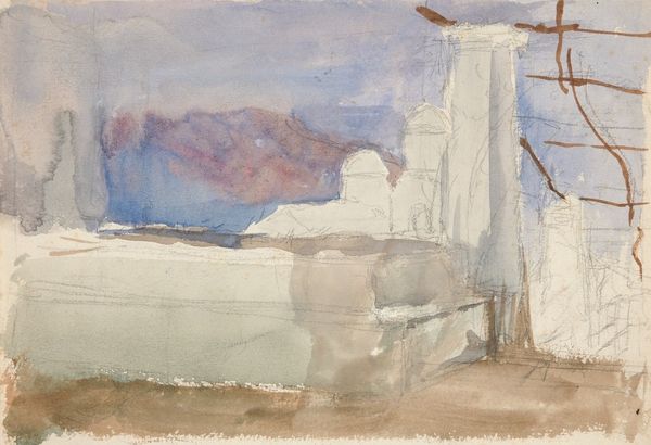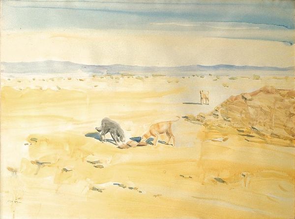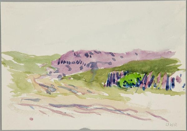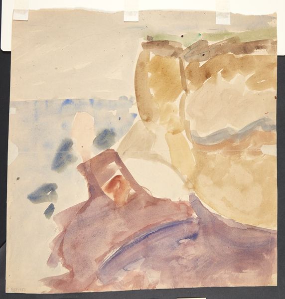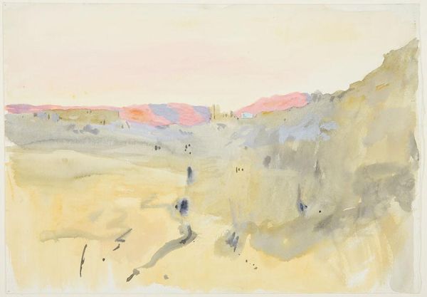 Curator: It's quite sobering. There's a muted palette, the ochre and drab hues feel incredibly bleak. Editor: That's a fair response. John Singer Sargent created this watercolor entitled "Dugout" around 1918. Consider that timeframe, and it's not just a landscape. Curator: Of course, World War I. It speaks volumes about the psychology of survival and shelter; those makeshift dwellings feel both fragile and essential. It captures the human need for safety amidst chaos. Editor: Exactly. These images offered glimpses into lives often unseen, influencing public opinion. The symbolism, however understated, of digging in, resonates even today with socio-political undertones of resilience and resistance. What is being hidden or protected? Who builds the dugout and what do they expect from it? Curator: Look closely—Sargent juxtaposes those heavy browns of earth and survival with wisps of blue sky. Is it hope? Escape? Or the reminder of a world beyond the trenches? The symbols offer a complexity which, despite being subtly introduced through color, offer the painting such gravity. Editor: And while watercolor can be seen as "less serious" or immediate, the immediacy is powerful. It allowed Sargent to quickly document scenes and relay their impact without heavy staging. How do the formal qualities impact popular memory, for example? Sargent used his name to validate these "snapshots." It certainly raises interesting questions about authority and visual truth. Curator: The very idea of truth in a time of war. I agree. The way Sargent used accessible media invites viewers in to reflect and process experiences. There are archetypal meanings here—of safety, the desire to protect, of the psychological and emotional toll war takes. The painting reveals the paradox: strength in fragility and despair juxtaposed against nature's unyielding rhythms. Editor: Ultimately, "Dugout," speaks to how conflict shapes individual experience and collective identity, demonstrating the critical role artists play in portraying and contesting these very memories. Curator: Very true, a chilling reminder and a beautiful consideration on Sargent's role as a cultural communicator.