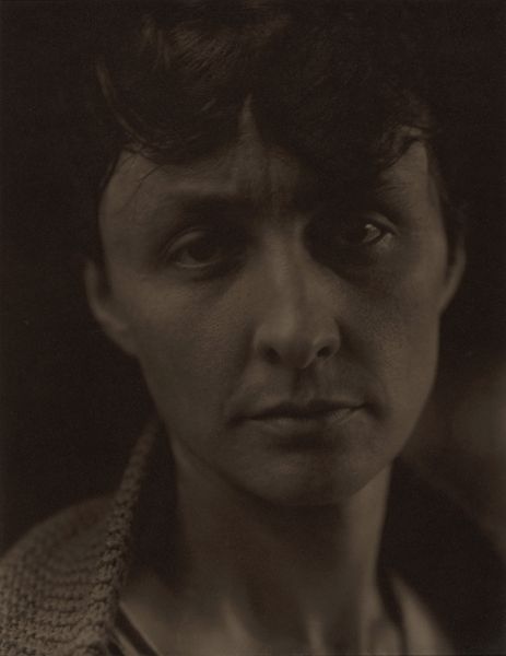 Editor: This is a photograph titled "Georgia O'Keeffe with Matisse Sculpture," taken by Alfred Stieglitz in 1921, using the gelatin-silver print process. I’m struck by the monochrome palette and the juxtaposition of O'Keeffe's gaze with the presence of the sculpture. How do you approach interpreting a photograph like this? Curator: My primary focus falls on the formal arrangements within the frame. Notice the composition. It is divided, subtly, into thirds. O’Keeffe’s face, itself a study in subtle gradations of light and shadow, occupies one. The sculpture, another. Then, consider the tonal range. Editor: The tonal range is quite limited. A study in beige and cream. Curator: Precisely. It leans heavily on the mid-tones. Ask yourself: what does the tight tonal range accomplish? Does it flatten the space, emphasizing the two-dimensional nature of the photograph? Is it possible Stieglitz pursued a Pictorialist strategy? How is the artist attempting to transcend the photograph’s documentarian reality? Editor: I hadn't considered how Pictorialism could play a role here. Focusing on those formal aspects shifts my understanding quite a bit. It's not just about *who* is in the photo, but how Stieglitz is constructing the image itself. The lighting, the limited palette... they all contribute to a carefully constructed artistic statement. Curator: Indeed. Consider the subtle grain of the gelatin-silver print and the careful arrangement of the subjects within the frame. These material and compositional elements shape our experience. The medium, its texture and tonal possibilities, contribute fundamentally to meaning. It moves beyond simple representation. Editor: So, by focusing on the structure and materiality, we can move towards decoding the visual language that Stieglitz is employing. It's less about external references and more about what's intrinsically present in the artwork. Curator: Precisely. It is in this close reading that art historical methodologies truly begin.