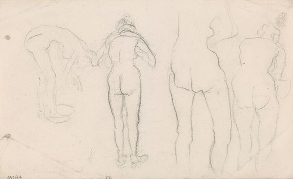 Curator: Looking at this study by Van Gogh titled "Idol and Sketches of Venus," dating from 1886, several quickly rendered figures emerge from a light ground. The piece uses pencil and graphite on paper and it currently resides at the Van Gogh Museum in Amsterdam. What's your immediate take on it? Editor: Raw energy! The composition feels almost frantic, like he’s chasing something fleeting. There’s a stark vulnerability, like the figures were captured on paper not as themselves but as quick sketches. Curator: Yes, there's a vulnerability in his studies of the nude. Here, the figure's turned back invokes a classical, almost stoic posture, yet it’s offset by other forms suggestive of Venus, who represents love and desire. Editor: Love and desire fighting against a closed off or withheld emotional energy? This piece feels more like wrestling with self perception than anything else, or even societal expectation of what a body, especially Venus, should look like. It’s quite subversive for its time! Curator: It definitely plays on these classical notions and disrupts them simultaneously. This piece almost seems like a meditation on idealized form versus perceived reality and is also a window into Van Gogh’s early academic pursuits in Paris, attempting a classical mode. Notice the artist's detailed rendering of anatomy. Do you see how the shading communicates more than just form, hinting at shadow, but also anxiety or emotional heaviness? Editor: It’s less about capturing light and more about expressing the weight of something intangible, isn't it? You can almost see Van Gogh pushing against the rigid constraints of academic art. Those rapid lines almost scream "freedom!" And it’s interesting that he merges his sketch with a study of an idealized object - almost fighting those ideas out. The goddess form, and his interpretation of the "Idol," makes the old ways clash with something new and personal. Curator: That push and pull is evident throughout his career, making his interpretations so much richer than if he'd followed the prescribed path. What I find most engaging is his ability to capture a universal sense of tension. We can still connect with it, can’t we? Editor: Absolutely! You are drawn into the intimate act of creation. It reminds me that even the greatest masters struggle and evolve, always searching. Thank you for highlighting the history and artistic growth that makes this particular work speak to me today.