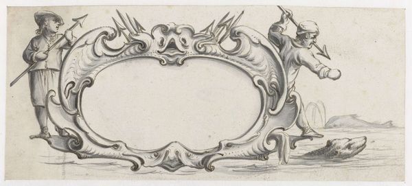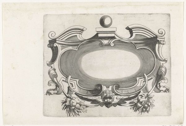 This is an engraving by H. Picart depicting a cartouche, notable for its elaborate ornamentation and the symmetry of its design. The composition immediately draws the eye to the central oval space, framed by an intricate arrangement of figures and decorative elements. Notice how Picart uses the structure of the cartouche to play with themes of balance and containment. Two winged female figures flank the central space, their bodies mirroring each other to create a symmetrical effect. The floral elements interspersed throughout add texture and depth, softening the rigidity of the cartouche's outline. These details function as signifiers, perhaps alluding to themes of nature, abundance, and the passage of time. The interplay between the organic and the geometric in Picart’s engraving destabilizes conventional boundaries between nature and artifice, suggesting a world where the natural and the constructed coexist. The careful arrangement of lines and forms serves not only aesthetic purposes but also invites contemplation on the dynamic relationship between structure and ornamentation, and ultimately, meaning and representation.