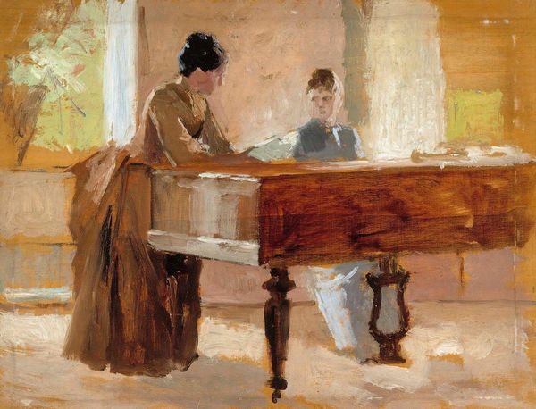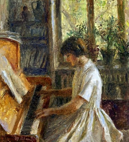 Nikolay Bogdanov-Belsky created this oil on canvas painting, entitled 'Symphony,' in 1909. It depicts a group of young women gathered around a piano, bathed in soft light. The scene evokes a sense of intimate musicality. Made in Russia during a period of cultural efflorescence, the painting reflects the values of the Russian intelligentsia at the beginning of the 20th century. The emphasis on education, music, and the cultivation of the arts speaks to the cultural aspirations of a society on the cusp of great change. The interior setting, with its glimpse of nature through the window, suggests a retreat from the wider social unrest. It is possible that this also evokes the increasing social emancipation of women in the early 20th century. Historians might consult period literature, musical scores, and social commentaries to better understand the painting’s cultural significance. Through such contextual research, we can gain insights into how art reflects and shapes the values of its time.