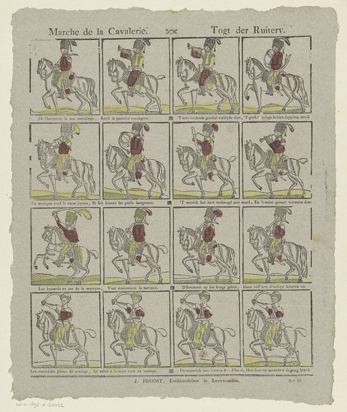 Curator: This engraving by Izaak Enschedé, created in 1730, is a fascinating example of early comic art. It depicts a series of rather strange figures with even stranger attributes, a visual bestiary if you will. What strikes you most about this work? Editor: It looks almost like an antique storyboard with these little panels each containing an odd creature. I am just curious, though, what's with all the strange caricatures? Curator: Well, let’s consider the period in which it was made. This piece emerges from the Dutch Baroque, a time of significant social and political upheaval as the Dutch Republic navigated its identity. The satirical nature of the prints, paired with exaggerated forms, likely served as a form of social commentary. Each panel, while comical, could represent types of people, behaviours, and moral lessons. How do you think these images engage with the idea of identity? Editor: I guess the characters could symbolize aspects of the society at that time? For instance, if some were in positions of authority, these comical and weird bodies might make commentary on that imbalance? Curator: Exactly. The grotesque, the humorous, the downright absurd—these are all strategies artists employ to critique power structures. What about the decision to depict these as individual panels? How does that contribute to its message? Editor: It almost reads like a deck of playing cards. It might make the issues the print is presenting, such as morality and acceptable behaviour, more approachable? Curator: Yes! By presenting it this way, Izaak makes the commentary more playful, and perhaps less openly confrontational, making the critiques easier to digest by his audience, while getting the message across nonetheless. Editor: This was very interesting. I see that comic art can be more than funny images, it could be used for historical and cultural critique.