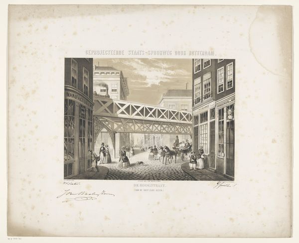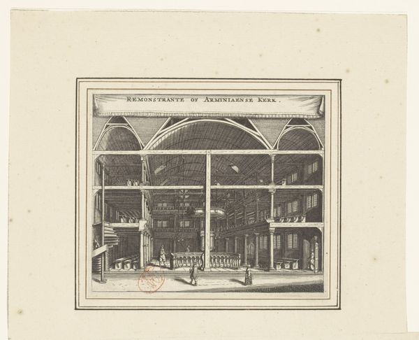 Curator: Let's spend a moment with "Gezicht in de Galerie d'Orléans van het Palais-Royal in Parijs," or "View of the Galerie d'Orleans at the Palais-Royal in Paris" by Louis-Julien Jacottet, created in 1838. It’s an engraving printed on paper. Editor: Immediately, I’m struck by how airy it feels despite the clear structural rigidity. There's almost a dreamlike quality in the rendering of light and shadow... a romantic kind of detachment, maybe? Curator: Exactly! The artist beautifully captures that burgeoning era of grand Parisian arcades. They became these crucial spaces blurring public and private, commerce and leisure. Can you sense any echoes of that socio-cultural shift here? Editor: Definitely, it's visible in how he uses the architecture. The glass roof isn’t just about light—it's a symbol of modernity, an opening up, if you will. But it’s all so meticulously crafted; that regular rhythm of the columns, balanced by the asymmetry of the figures, must say something about the societal undercurrents. Curator: Ah, now you are tuning into it! And that fine-lined rendering of the figures. It's genre painting as documentation; those Parisians themselves are, indeed, compositional symbols within this theater of commerce and fashion. It evokes Walter Benjamin and his idea of the flâneur… do you see that subtle interplay? Editor: The flâneur observing from the margins, yes. And look at the faces – just hinted at, blurry but present. I almost feel like *I'm* that observer, transported back in time, wandering through the arcade. The romanticism in Jacottet's depiction feels so precise and palpable. It's not simply the setting, but the capturing of a fleeting moment. It’s an historical snapshot—I wish I had lived it. Curator: Indeed. Its beauty, its almost paradoxical atmosphere… it reveals so much with a line, wouldn’t you agree? I am so glad to look at the piece today!