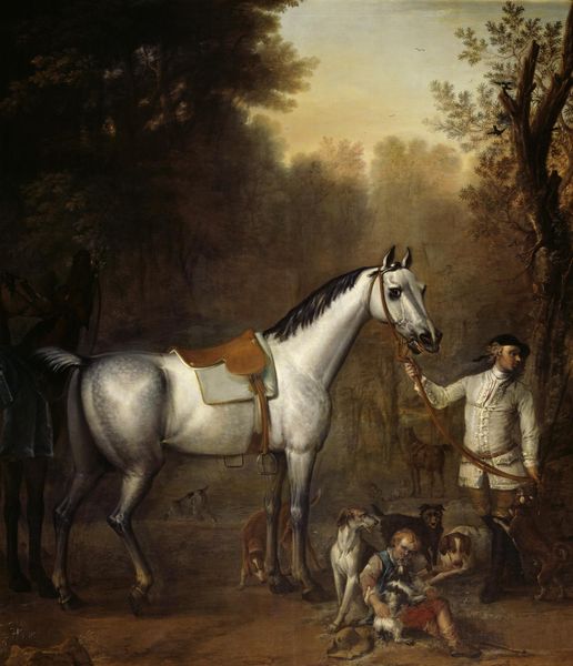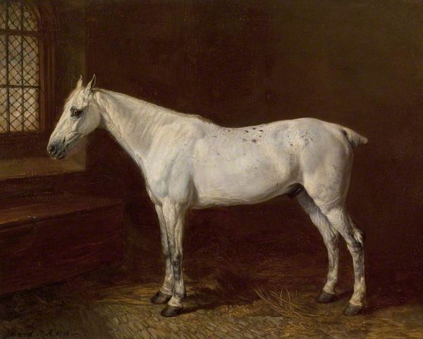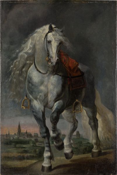 Editor: This is "Chevaux Gris Pommelé" – Grey Dappled Horses – by Théodore Géricault. It’s oil on canvas and the texture looks so rough and alive, particularly on the horses. It's striking how much the animals fill the frame. What do you see in this painting? Curator: Well, beyond the striking Romantic composition, I see a clear interest in the means of production here. Géricault's brushstrokes are almost violent, reflecting the physical labor involved. The raw materiality of the oil paint itself becomes a subject, blurring the line between high art and craft. Look at the near absence of background, everything serves the form of the horse. What might that tell us about the economic value or social use of this subject? Editor: I suppose it shows how important the horse was to society at the time. This focus feels different from typical history paintings though... It's like he’s more interested in the animals themselves rather than a specific heroic narrative. Curator: Precisely. And what does it suggest when an artist prioritizes animal bodies, their material existence, over idealized narratives? Is Géricault making a comment about labor? Who benefitted most from horses? Think about their role in agriculture, warfare, even leisure… These were commodities, instruments of power. Editor: So, he's highlighting the material conditions and labor tied to these animals, and even the paint itself reflects this? Curator: Yes, in a way it challenges traditional hierarchies. Géricault emphasizes the raw, physical reality of the horses and of making an artwork in his specific context. Editor: That definitely makes me look at it differently! Seeing the process and materials as central to the meaning – I'll remember that. Thanks! Curator: My pleasure. I hope that looking at the materiality, labor and social roles will inform our next analysis of art works as well.
