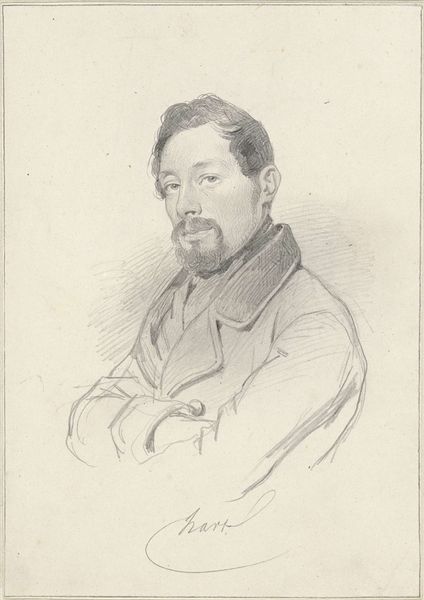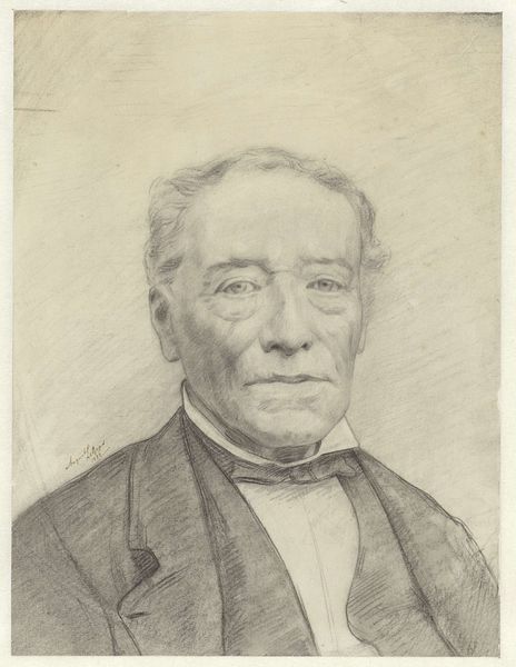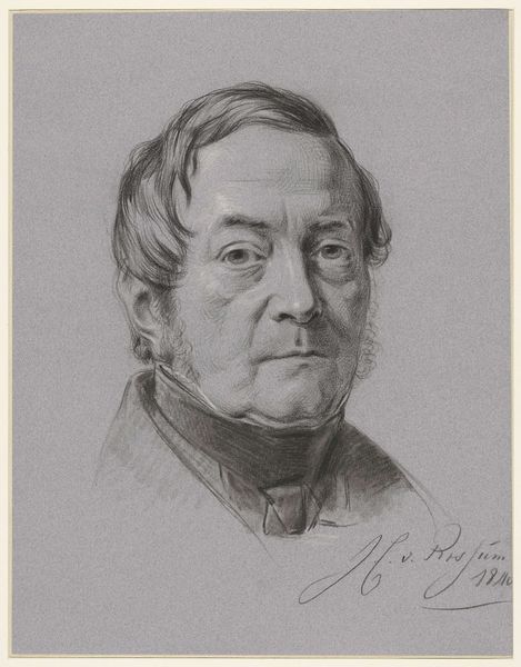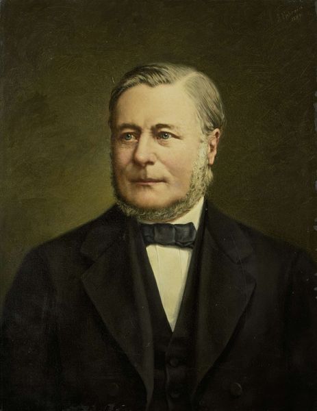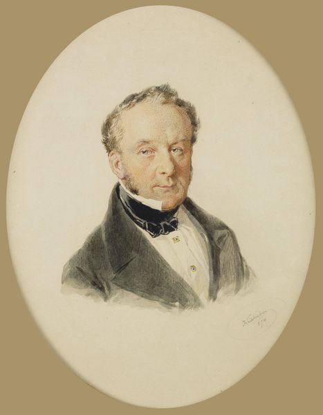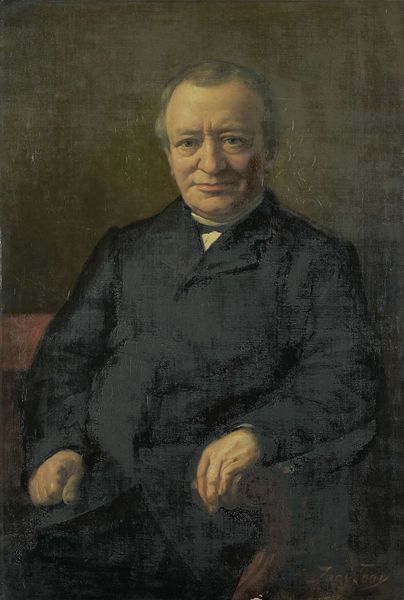 Editor: This is Gustave Courbet's "Portrait de Monsieur Corbinaud," painted in 1863. I’m struck by the almost stark contrast between the dark background and clothing, and the light illuminating the subject's face. What’s your take on the formal elements at play here? Curator: Well, immediately I observe the structure—the composition is incredibly simple, almost classical in its approach to portraiture. Notice how Courbet uses chiaroscuro, that contrast between light and dark, not to dramatize, but to bring a certain…volume to the face. How do you see that working formally? Editor: I think the tight focus on the face makes it about the subject’s presence, a statement in and of itself. There’s no need for extra frills when the surface details are already so captivating. The gaze itself, though, seems intentionally subdued, and there is something unsettling there. How might we address this, strictly from a formalist position? Curator: Indeed. If we attend solely to the formal aspects, we can say the painting has an undeniable monumentality achieved through restrained coloring and structured modeling, regardless of historical context. A sort of reduction to pure form—an effect both timeless and incredibly modern at the same time. And tell me, does the handling of light inform your own subjective response to this piece, outside purely structural concerns? Editor: I see how attending strictly to the formal qualities really forces one to hone in on what's presented to the eye, and not get carried away by history. It makes you respect what’s on the surface. Curator: Exactly. One cannot ignore structure if one wants to perceive the essence of the artwork!